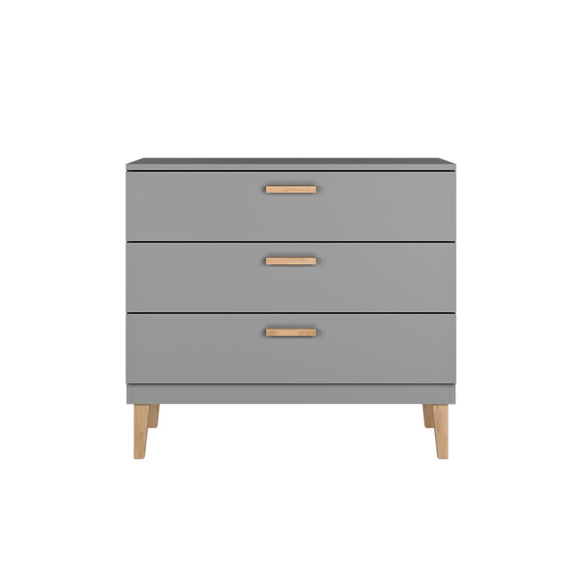 Moderna siva komoda KUBI s 3 prostranima ladicama. Komoda je pogodna za dječje sobe za djecu i studente. Bezvremenski skandinavski stil komode lijepo izgleda i savršeno se kombinira s ostalim komadima namještaja iz iste kolekcije.