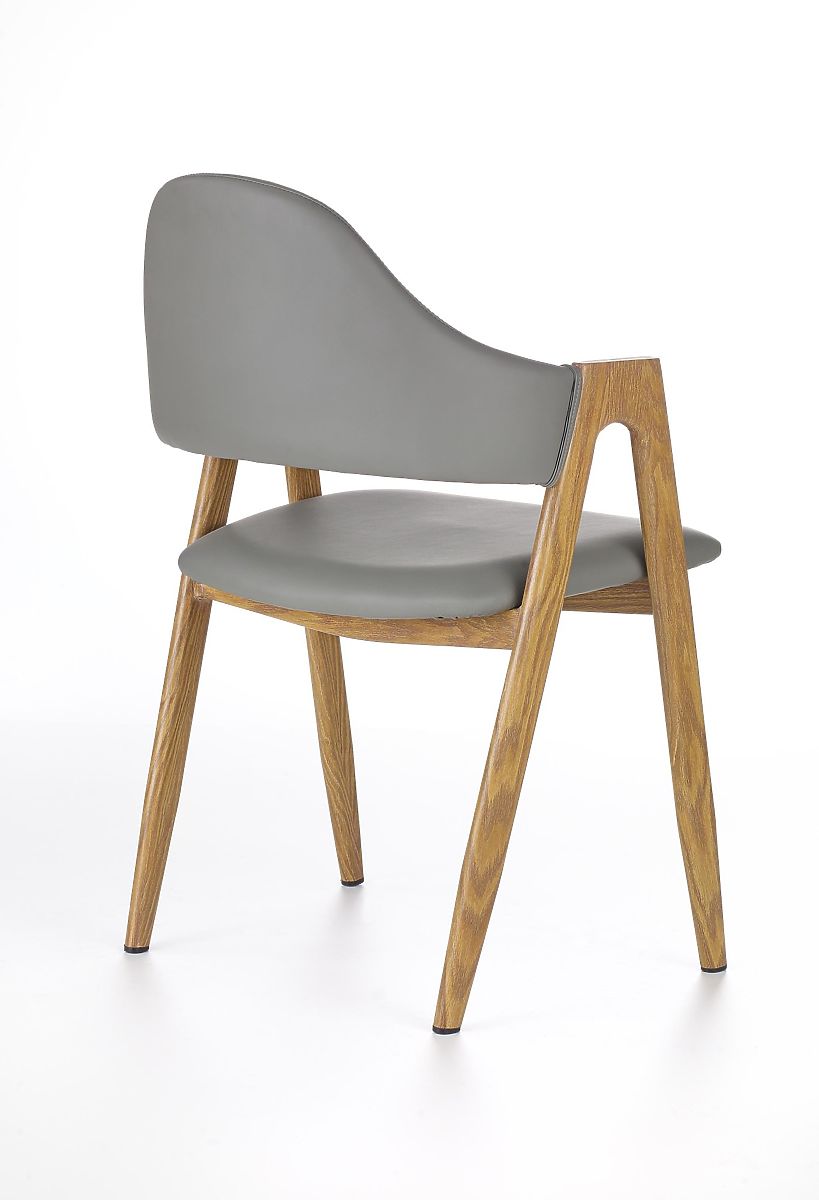 Stolica je presvučena bijelom eko kožom sive boje. Konstrukcija je izrađena od lakiranog čelika u boji medenog hrasta.