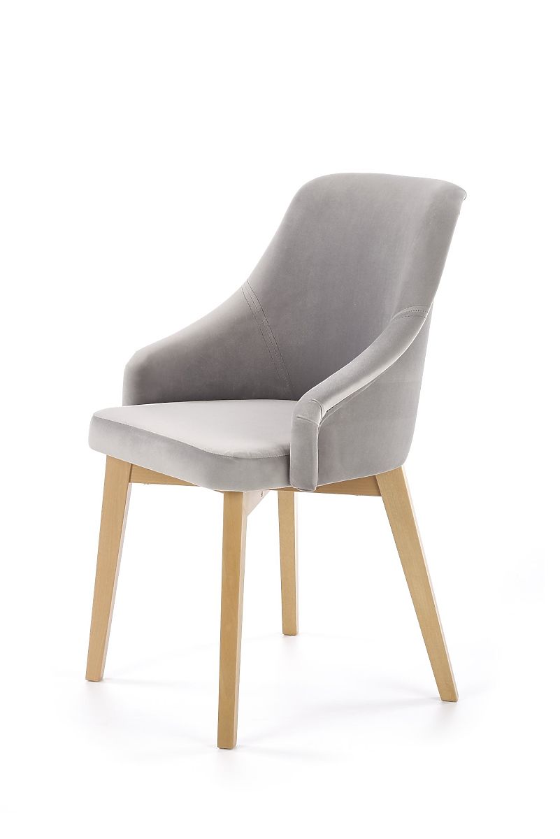 Konstrukcija stolice izrađena je od masivnog bukovog drva u nijansi mednog hrasta. Sjedalo i naslon presvučeni su ugodnom baršunastom tkaninom sive boje.