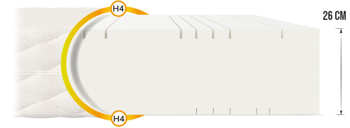 Zahvaljujući visokokvalitetnom Goya Max Plus pjenastom madracu visine 26 cm vaš san će biti najugodniji dio dana. Dvostrani madrac podijeljen je u 7 zona zahvaljujući nizu poprečnih i uzdužnih rezova. Kao rezultat toga, postignuto je značajno povećanje plastičnosti, što pruža izvrsnu potporu kralježnici .