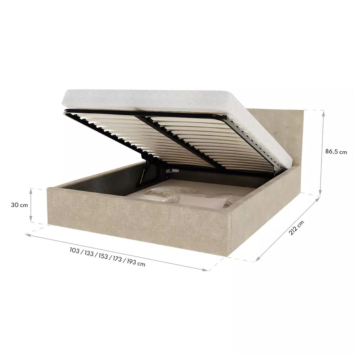Krevet TULSA opremljen je podiznom rešetkom i podiznim klipovima koji omogućuju stvaranje korisnog prostora za pohranu ispod kreveta. Ova vrsta skladišnog prostora iznimno je praktična, posebice u spavaćim sobama gdje je ključna veća ušteda prostora. Visokokvalitetna ploča namještaja od koje je krevet izrađen povećava čvrstoću kreveta i omogućuje mu da izdrži različita opterećenja i pritiske.
