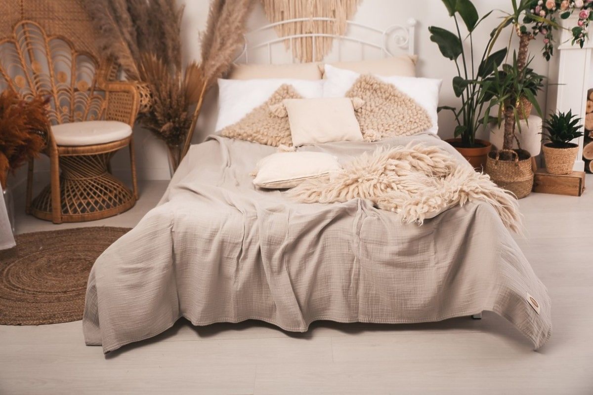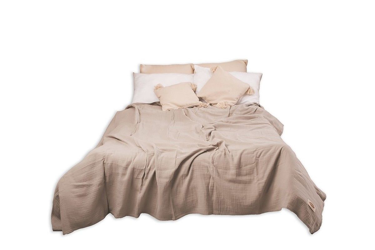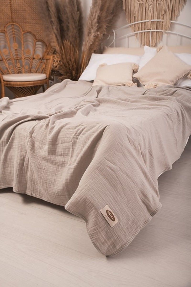 Prekrivač od muslina 240x210 cm. Lagan je, ugodan i mekan na dodir. Ima izvrsnu prozračnost i sposobnost regulacije temperature. Ne zahtijeva glačanje, uvijek ima estetski učinak i daje spavaćoj sobi ugodan izgled.