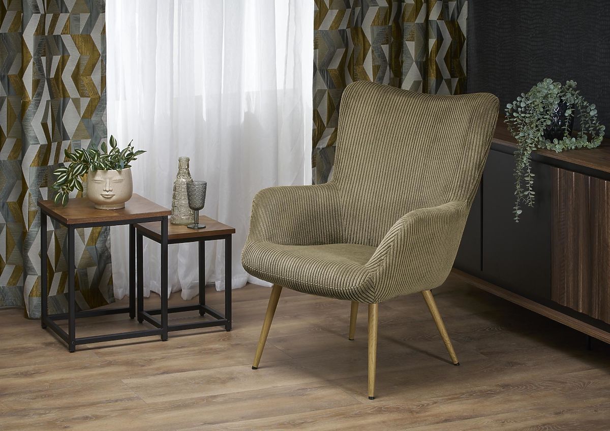 Samt u boji masline daje fotelji mek i sofisticiran izgled. Ova tkanina nije samo ugodna na dodir, već je i izdržljiva i laka za održavanje, osiguravajući dug vijek trajanja Vaše stolice.