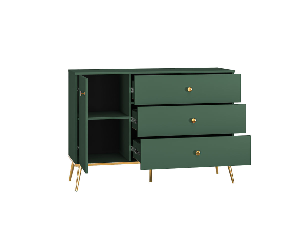 Obogatite svoj interijer unikatnim komadom namještaja u obliku manje komode Forest koja djeluje jednostavnog, minimalističkog dojma, ali će istovremeno svojom netipičnom kombinacijom boja tamno zelene i zlatne unijeti eleganciju, mir i sklad u vašem domu. Savršeno se uklapa u moderan interijer kao i život u retro stilu.