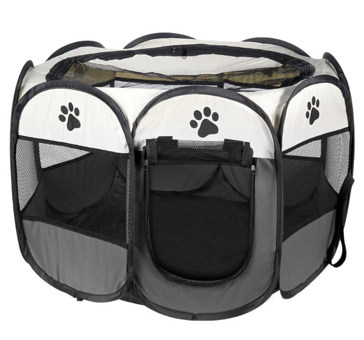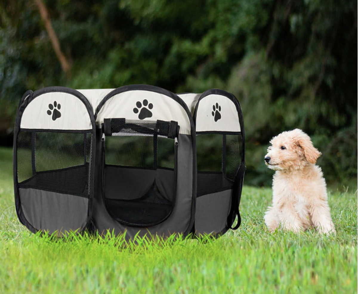 Sklopivi tekstilni ogradak izrađen na osnovi osmerokuta namijenjen za pse, štence, mačke i male životinje. Ogradak je idealno rješenje za vlasnike životinja, posebno kada je potrebno odrediti siguran prostor za njihove ljubimce. Proizvod je pogodan za upotrebu kako u kući, tako i na otvorenom.