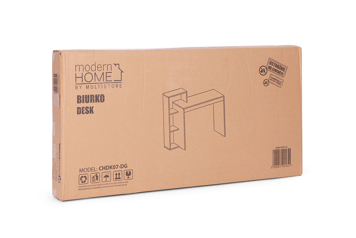 Moderni stol i jednostavan dizajn, to je ponuda za ljubitelje neobičnog stila i funkcionalnosti. Ploča i police izrađene su od iverice, prekrivene laminatom sive boje. Zahvaljujući tome, namještaj nježno sjaji i djeluje vrlo luksuzno.
