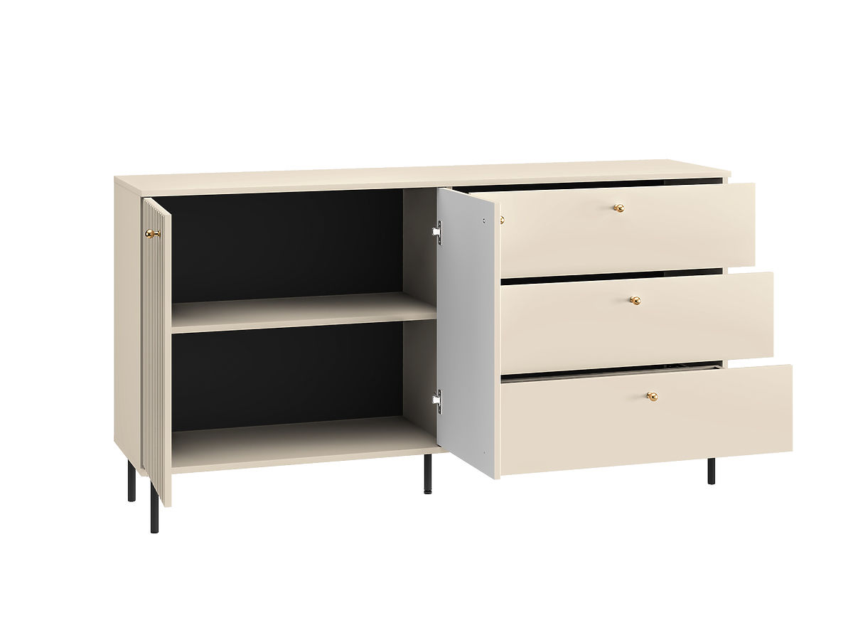Komoda Sophie u većoj verziji jedinstvena je kombinacija svijetlo bež dekora s modernim glodanim vratima, upotpunjena elegantnim zlatnim ručkama i crnim metalnim nogama. S ovom komodom izrađenom od kvalitetnih materijala nećete dobiti samo praktičan komad namještaja, već i stilski element koji će oživjeti vaš dom i dati mu ugodnu atmosferu.