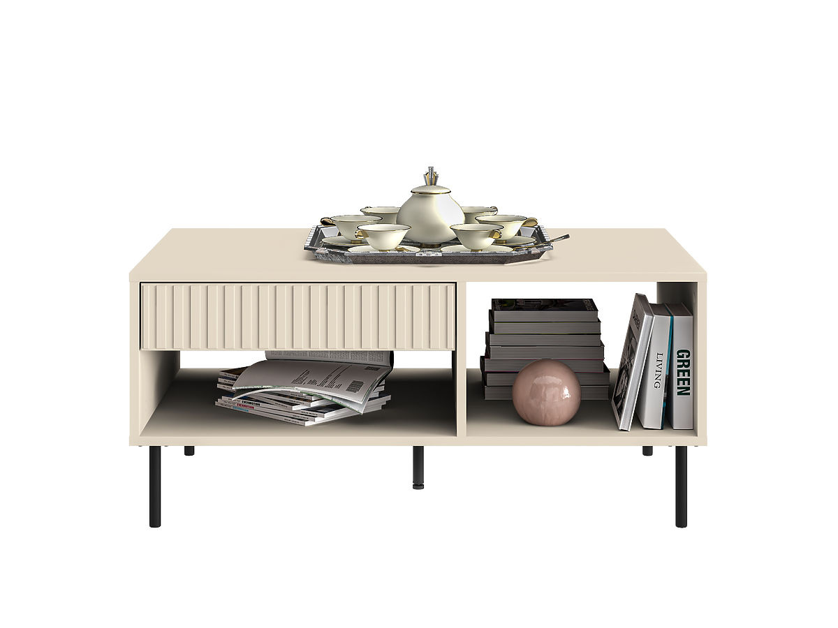 Stolić za kavu Sophie u bež dizajnu savršena je kombinacija elegancije i funkcionalnosti koja će u trenu oživjeti vašu dnevnu ili radnu sobu. Zanimljiv element namještaja je moderna glodana ladica i visoke metalne noge u crnoj boji. Stol je izrađen od visokokvalitetnih materijala i vrlo je praktičan zahvaljujući velikom prostoru za odlaganje.