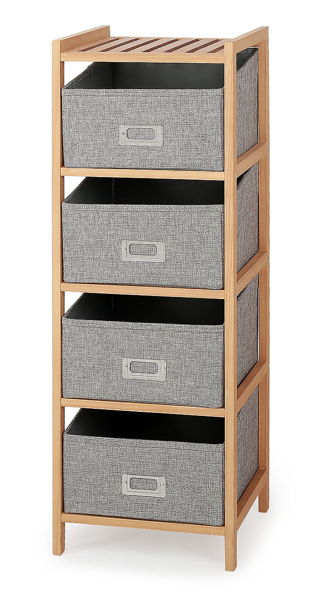Drveni regal s tkaninskim kutijama za pohranu. .. više