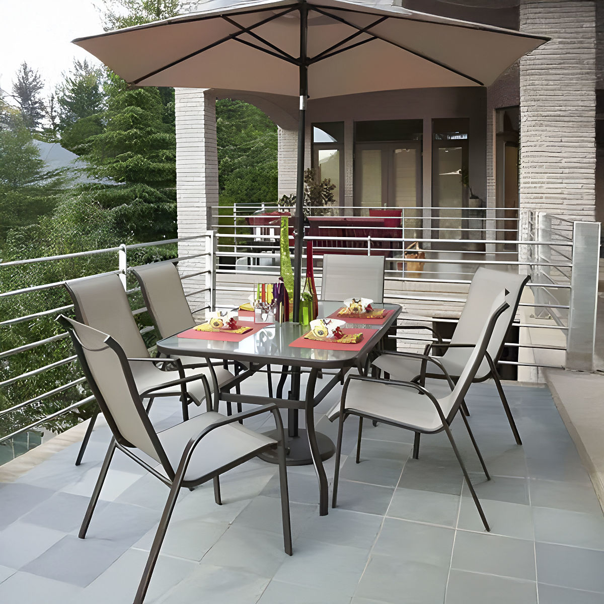 Vrtni stol s kaljenim staklom i otvorom za suncobran. .. više
