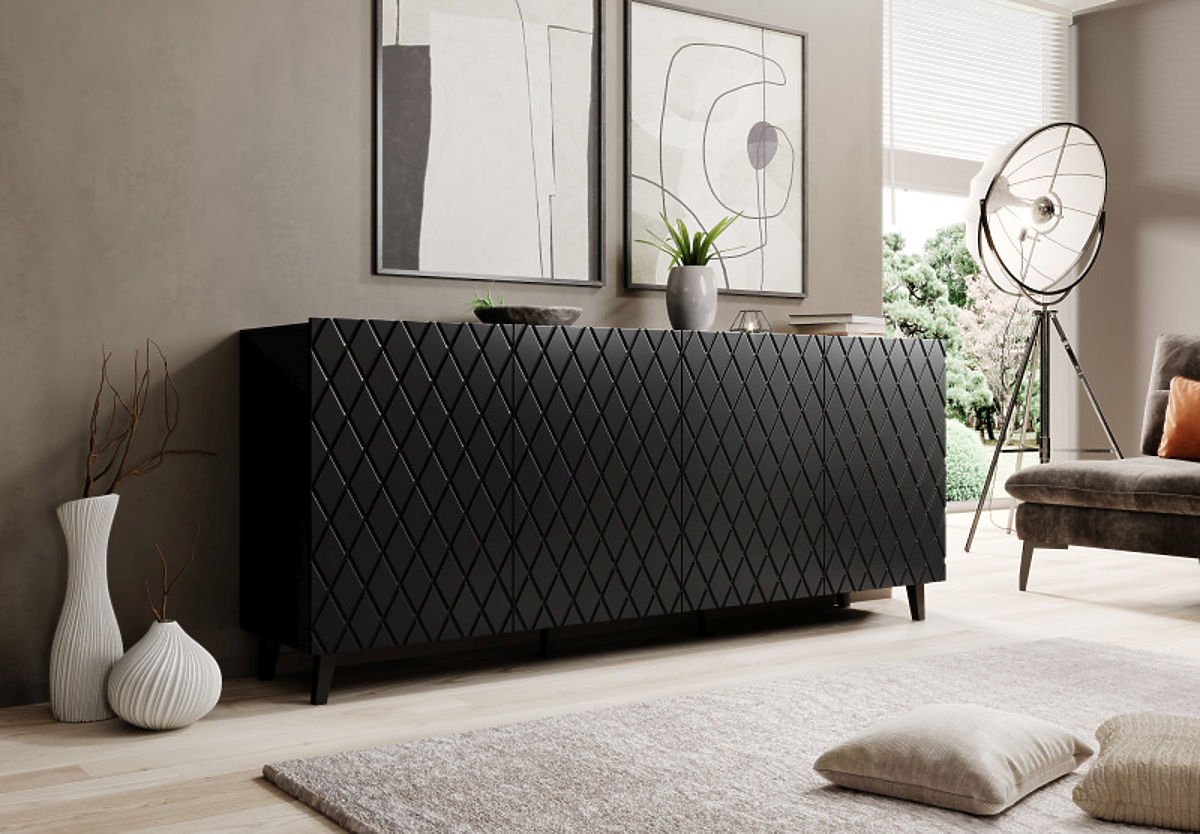 Komoda s crnim mat završetkom i vidljivim spojevima. .. više