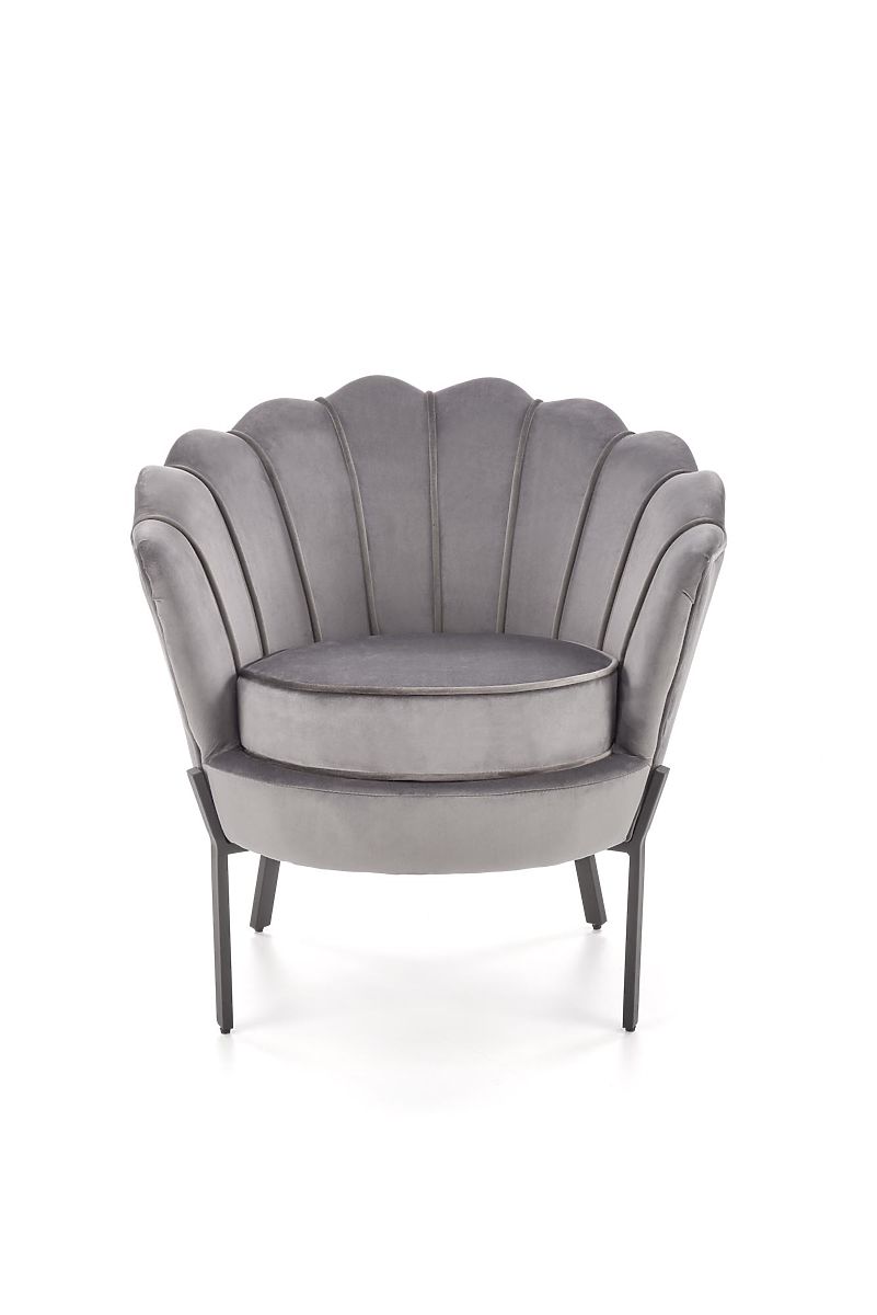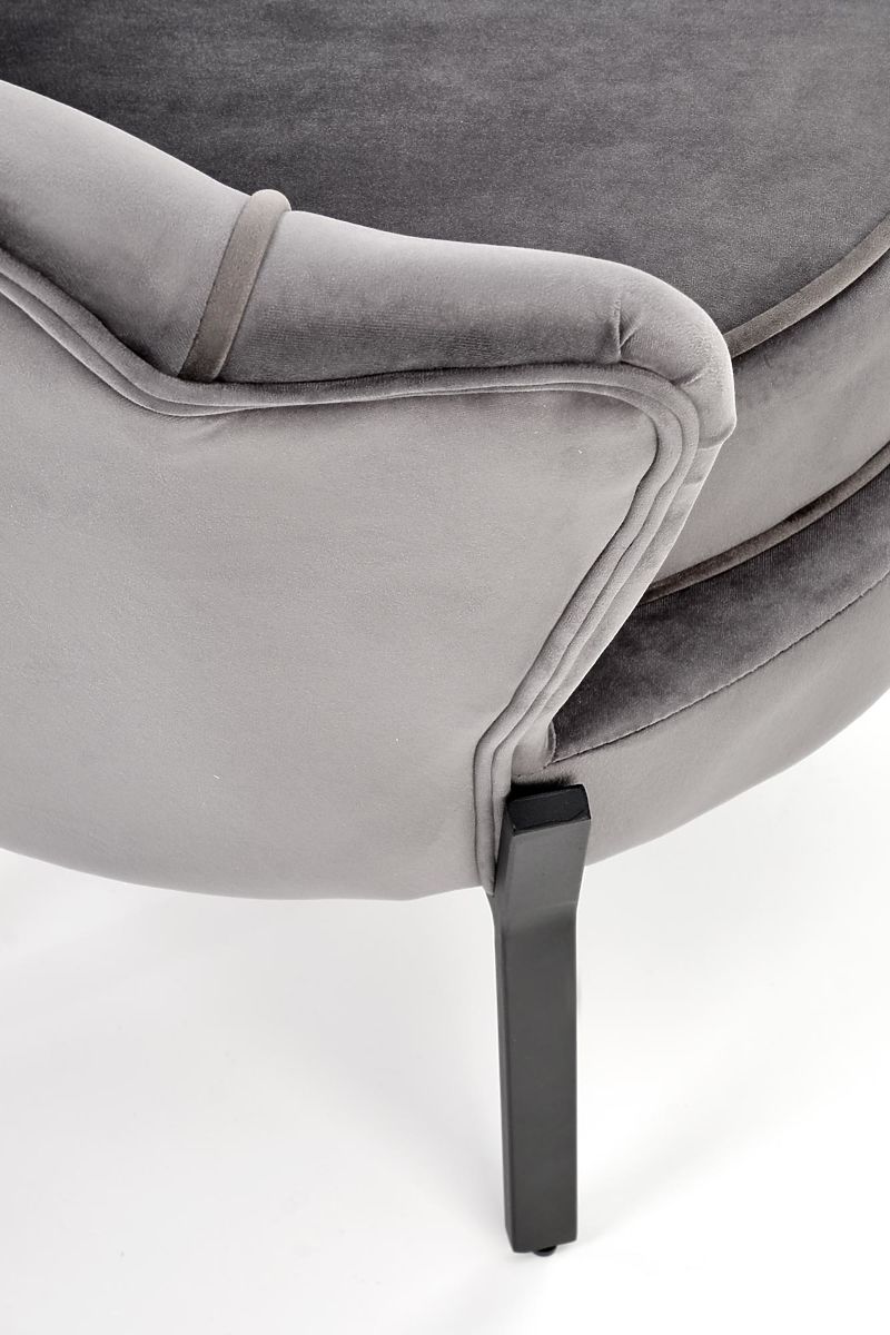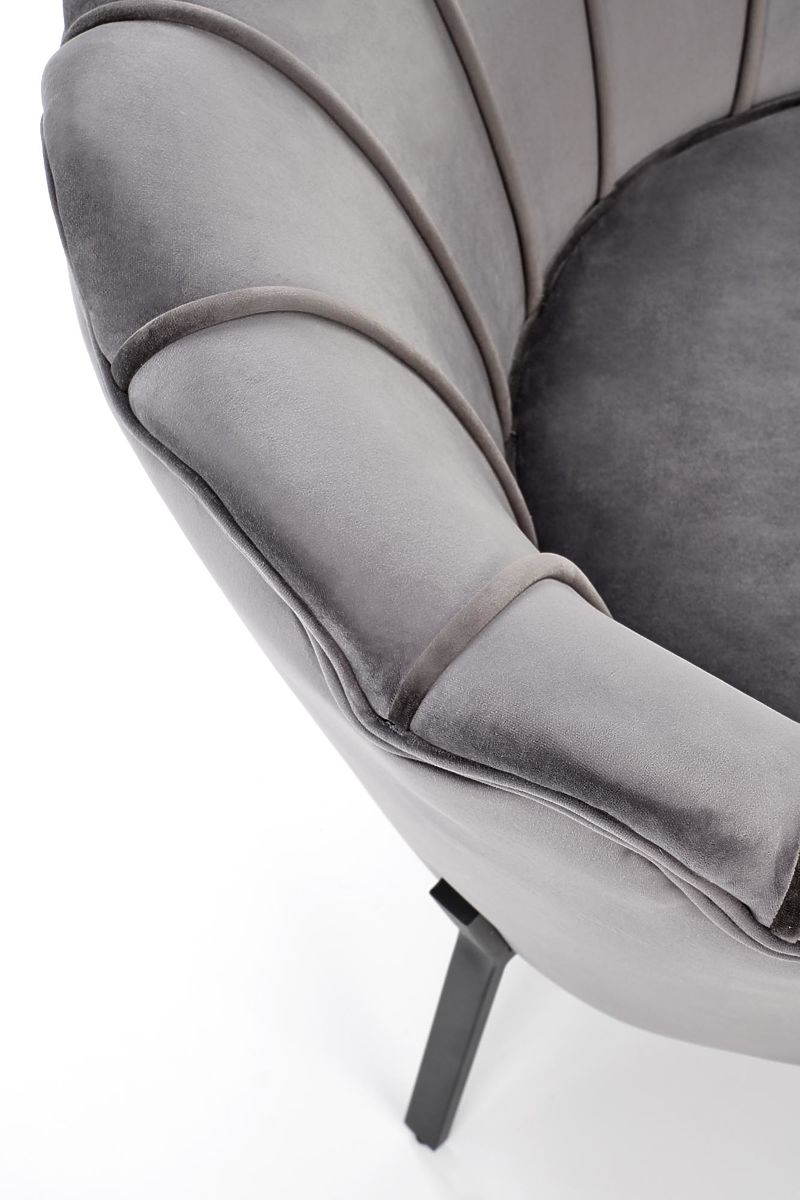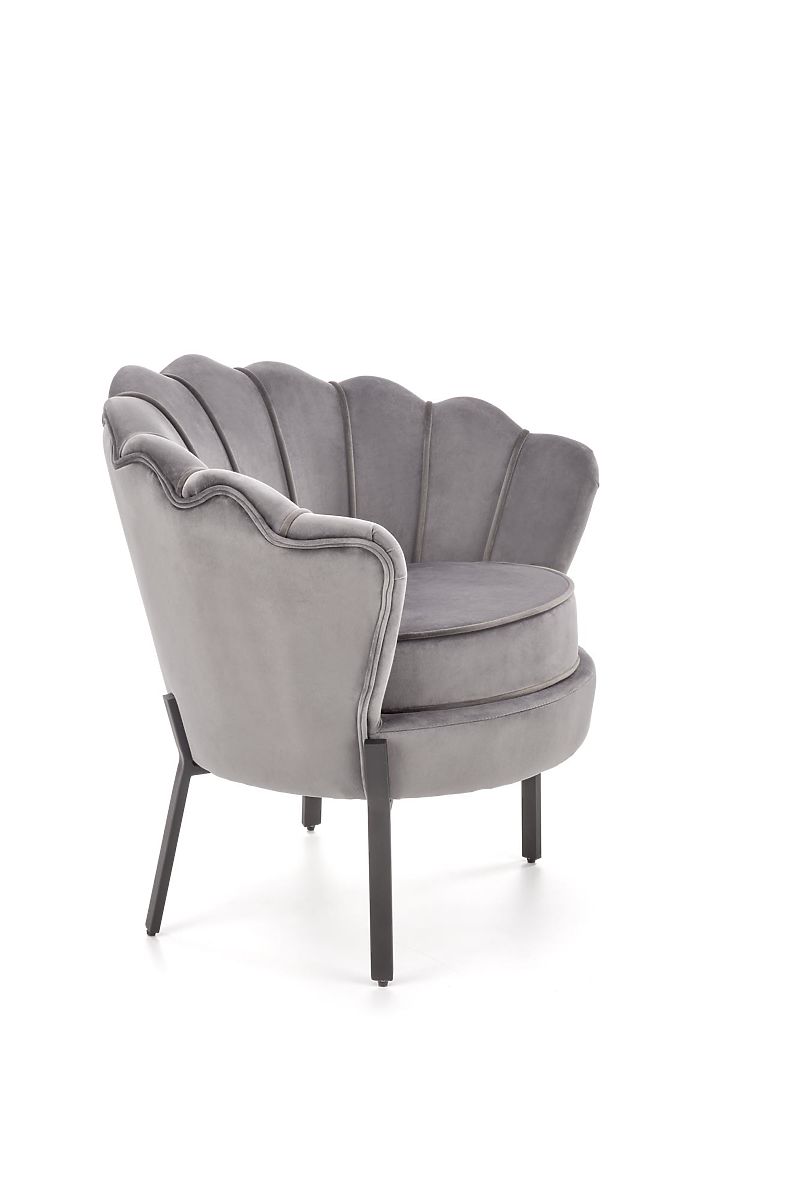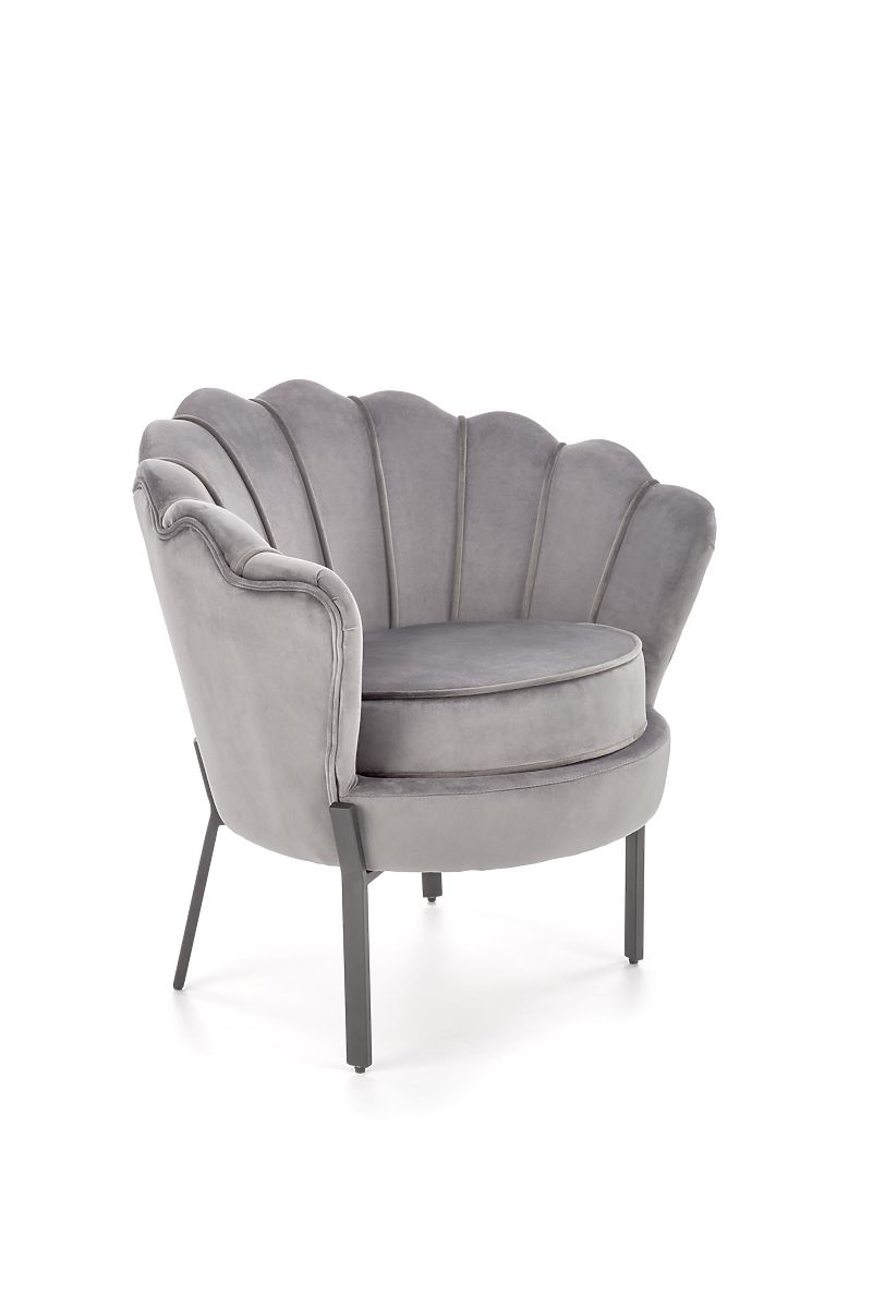 Siva baršunasta fotelja s čeličnim nogama. .. više