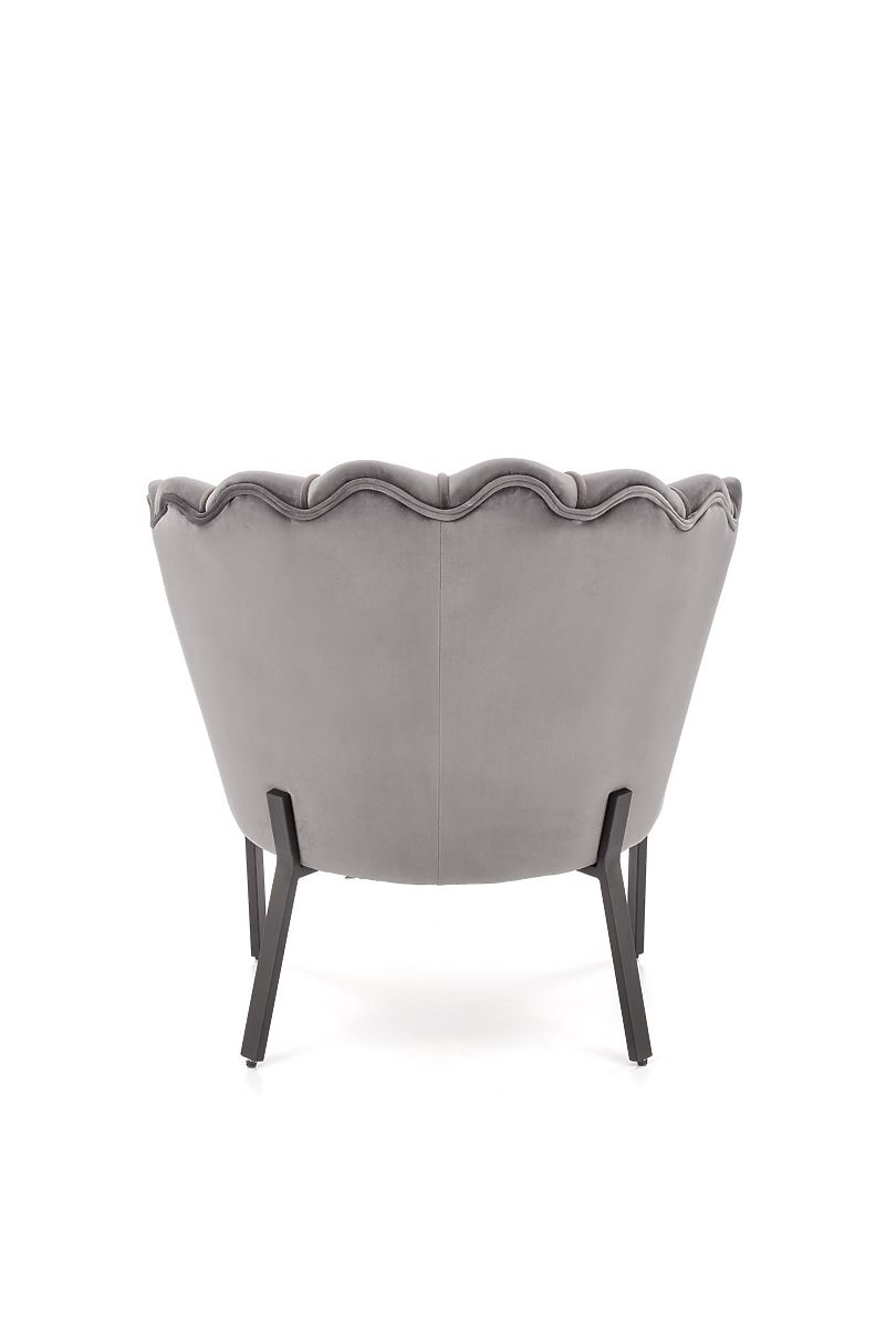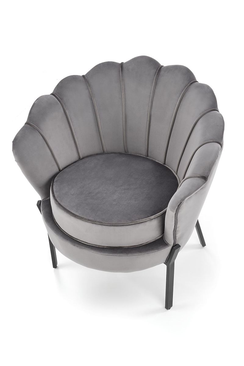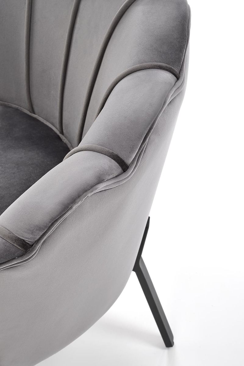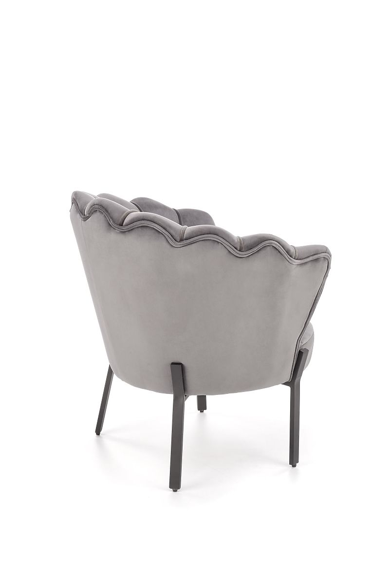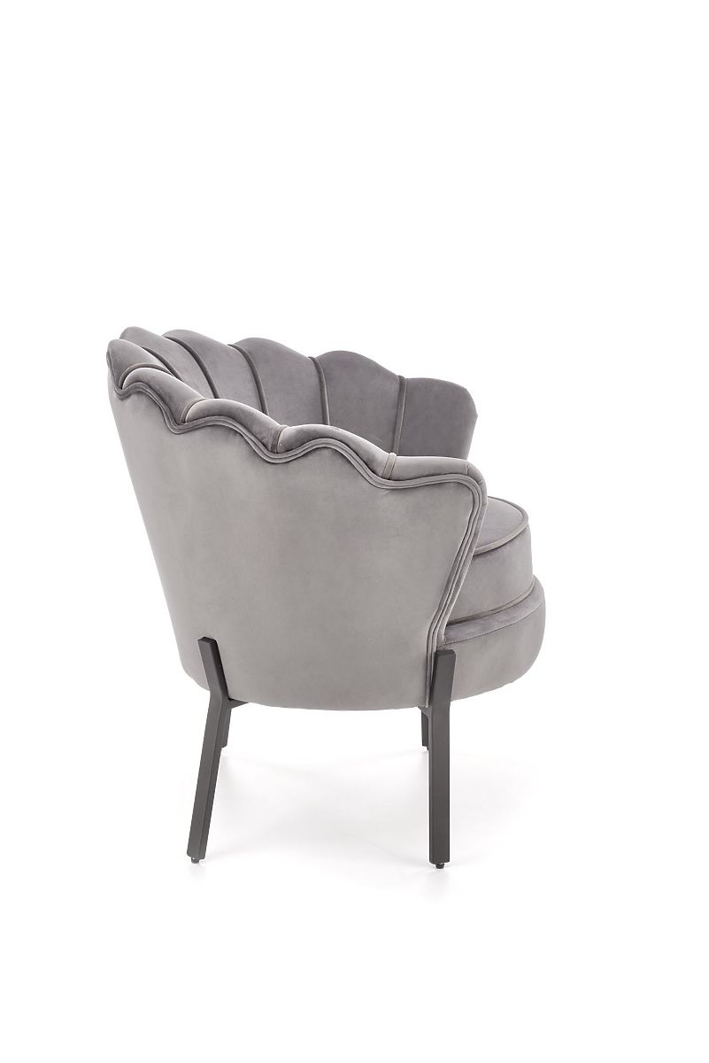 Siva baršunasta fotelja s čeličnim nogama. .. više