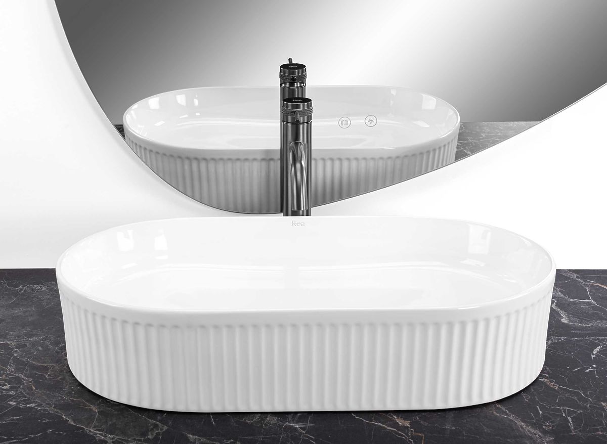 Nadgradni umivaonik od sanitarne keramike s rebrastom površinom. .. više