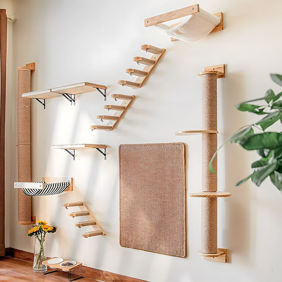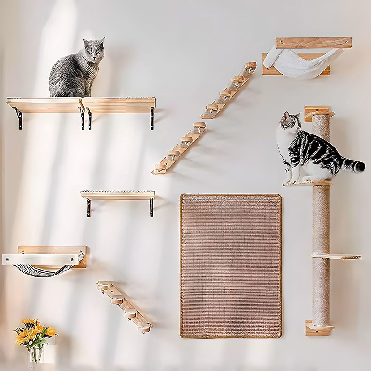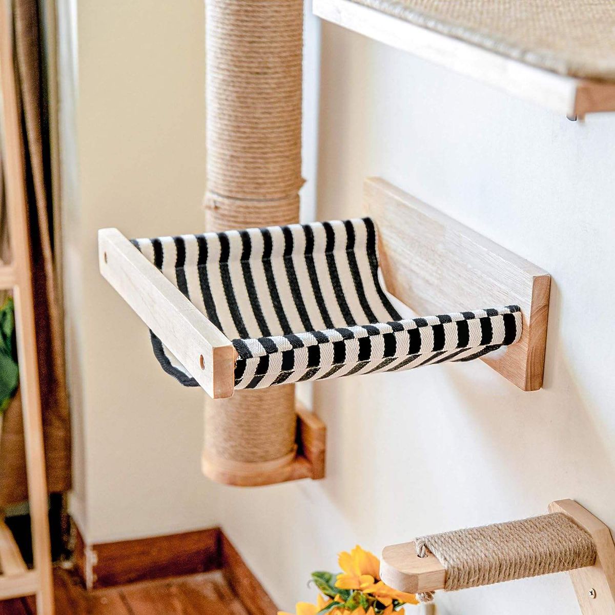 Predstavljamo vam izdržljiv i estetski hamak za mačke. To je idealno mjesto za odmor, ali također može poslužiti kao mjesto za igru vaše mačke. Hamak se može kombinirati s drugim elementima na zidu, što će stvoriti stazu za naše krznene četveronožne prijatelje. Zahvaljujući upotrebi visokokvalitetnih materijala, hamak je izdržljiv čak i za velike mačke.