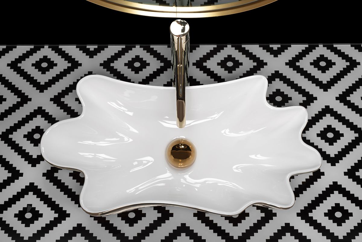 Umivaonik izrađen od najkvalitetnije keramike u bijeloj boji i ovalnom, valovitom obliku. Umivaonik je završen zlatnim rubom, što daje prekrasan konačni efekt. Umivaonik je nevjerojatno atraktivan na pogled, idealan je za ljubitelje nestandardnih oblika, donosi eleganciju u uređenje kupaonice kod kuće ili u uredu.