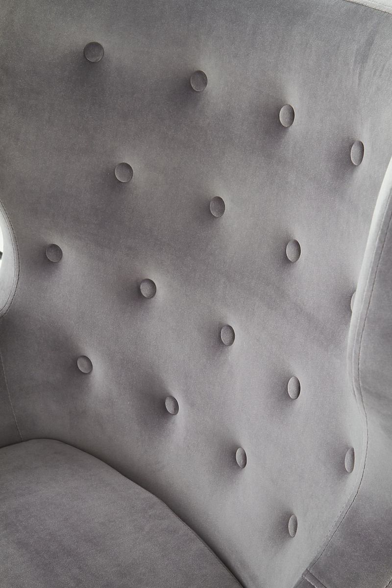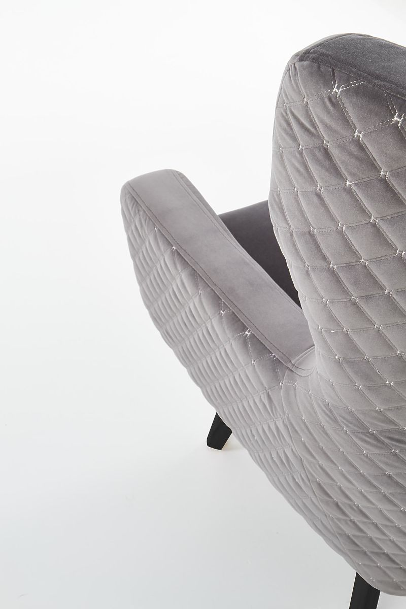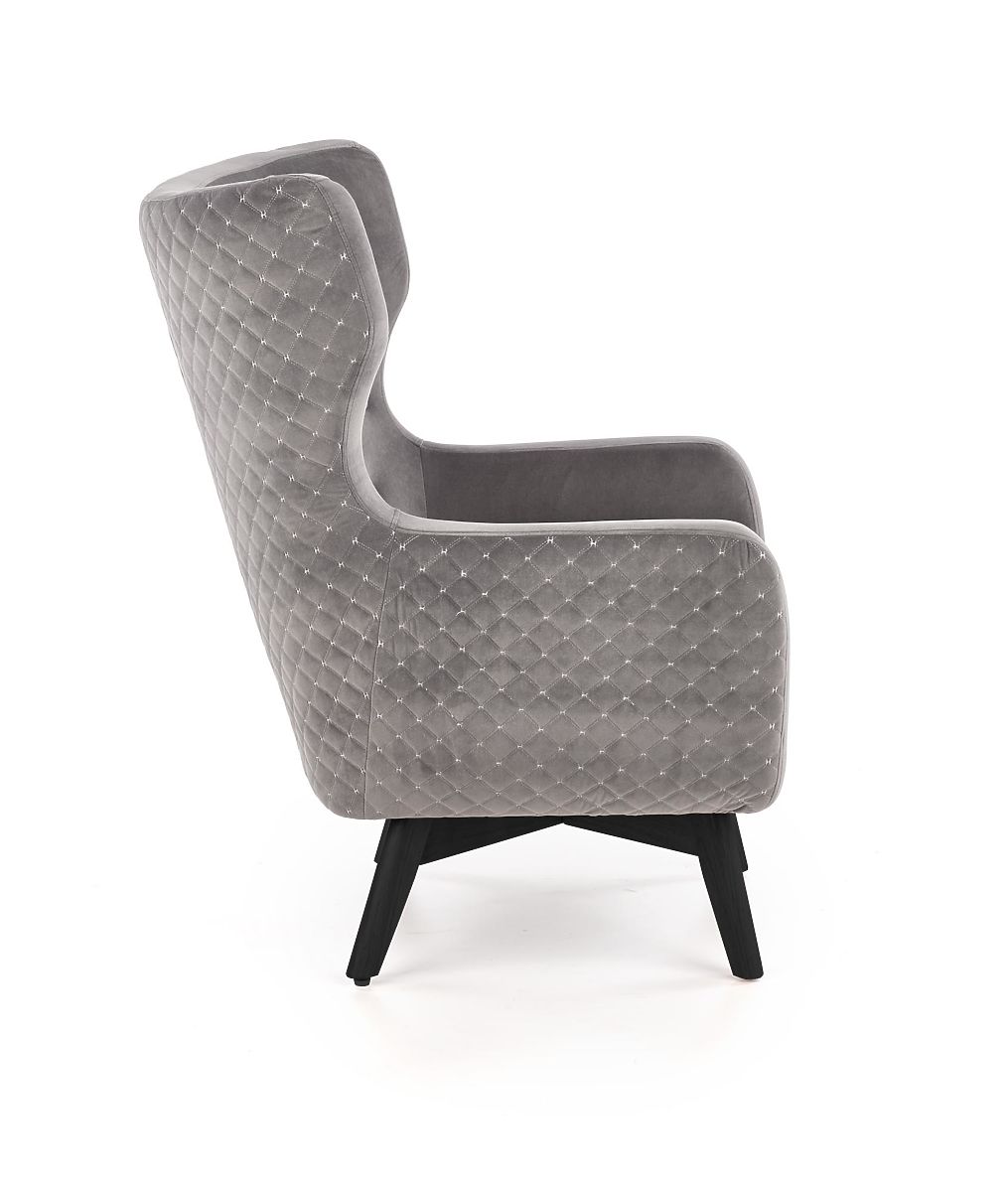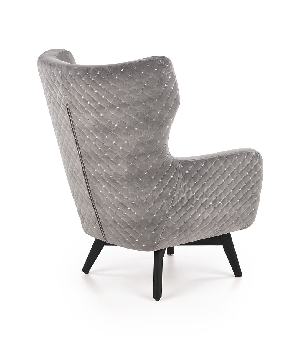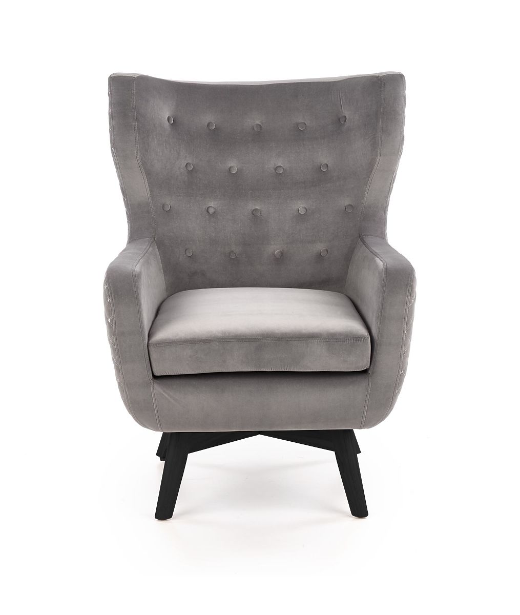 Relaksacijska fotelja od sive tkanine i crnog drva. .. više
