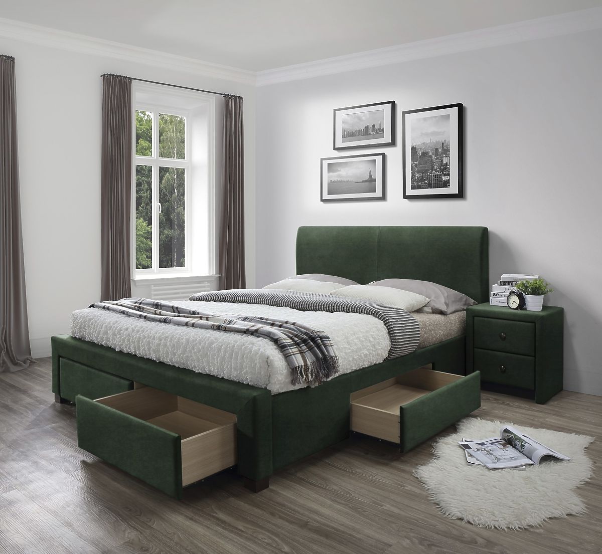 Krevet s ladicama od tamnozelenog baršuna. .. više
