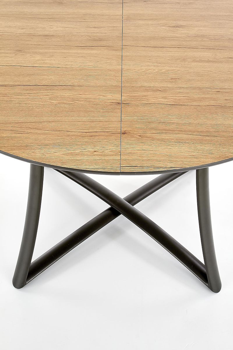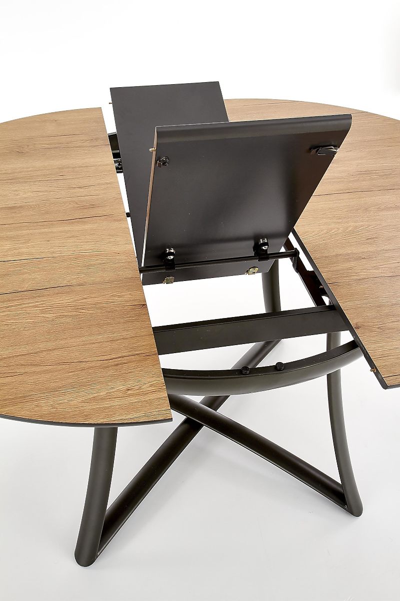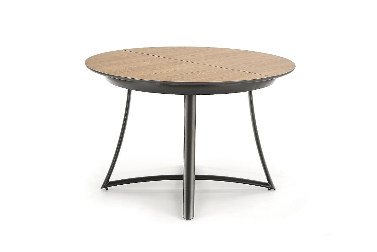 Okrugla ploča stola izrađena je od MDF ploče s furnirom zlatnog hrasta, koja vjerno imitira strukturu i uzorak prirodnog drva. Rasklopivi umetak širine 30 cm u pepeljasto sivoj boji stvara zanimljiv kontrast i daje stolu originalan izgled.