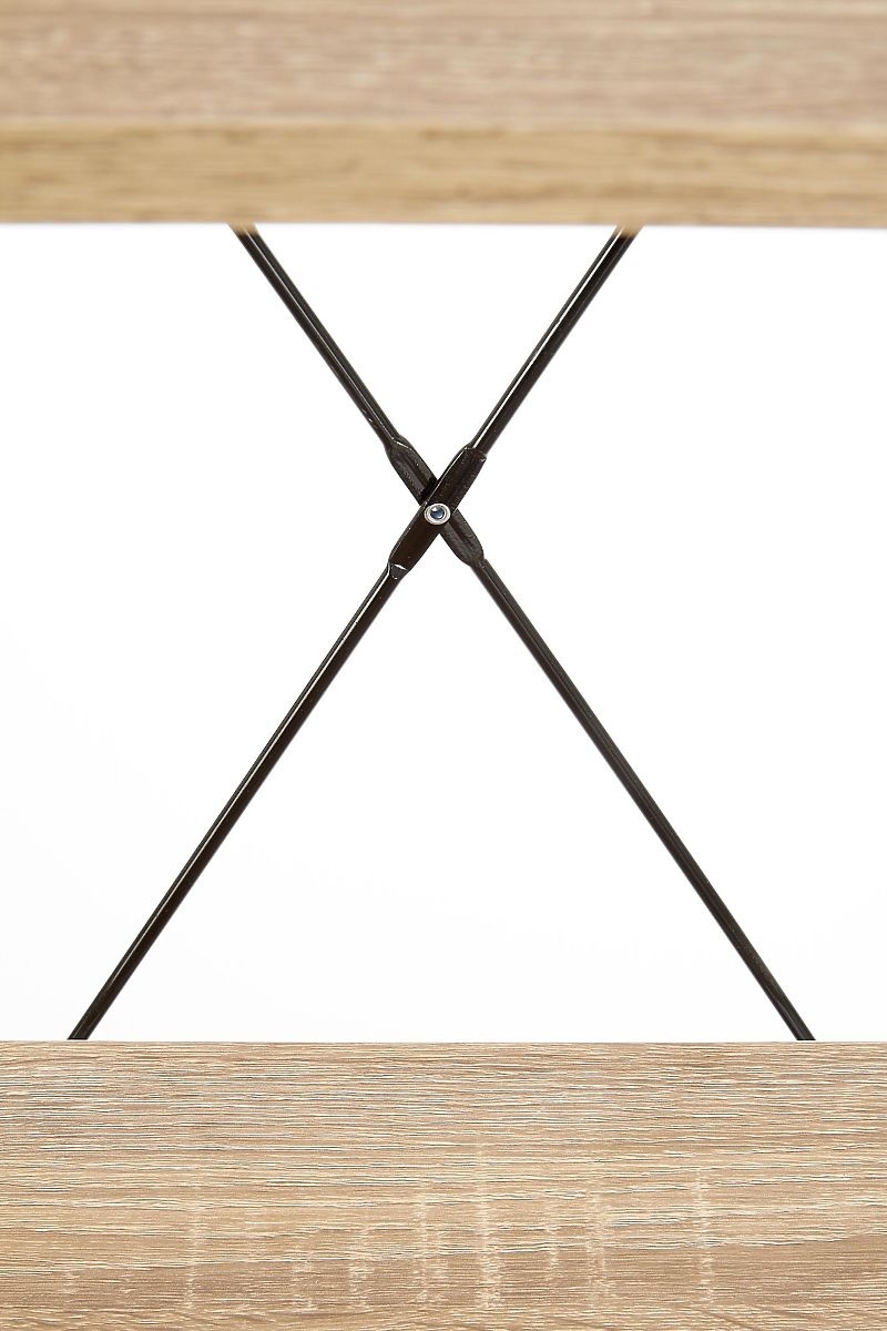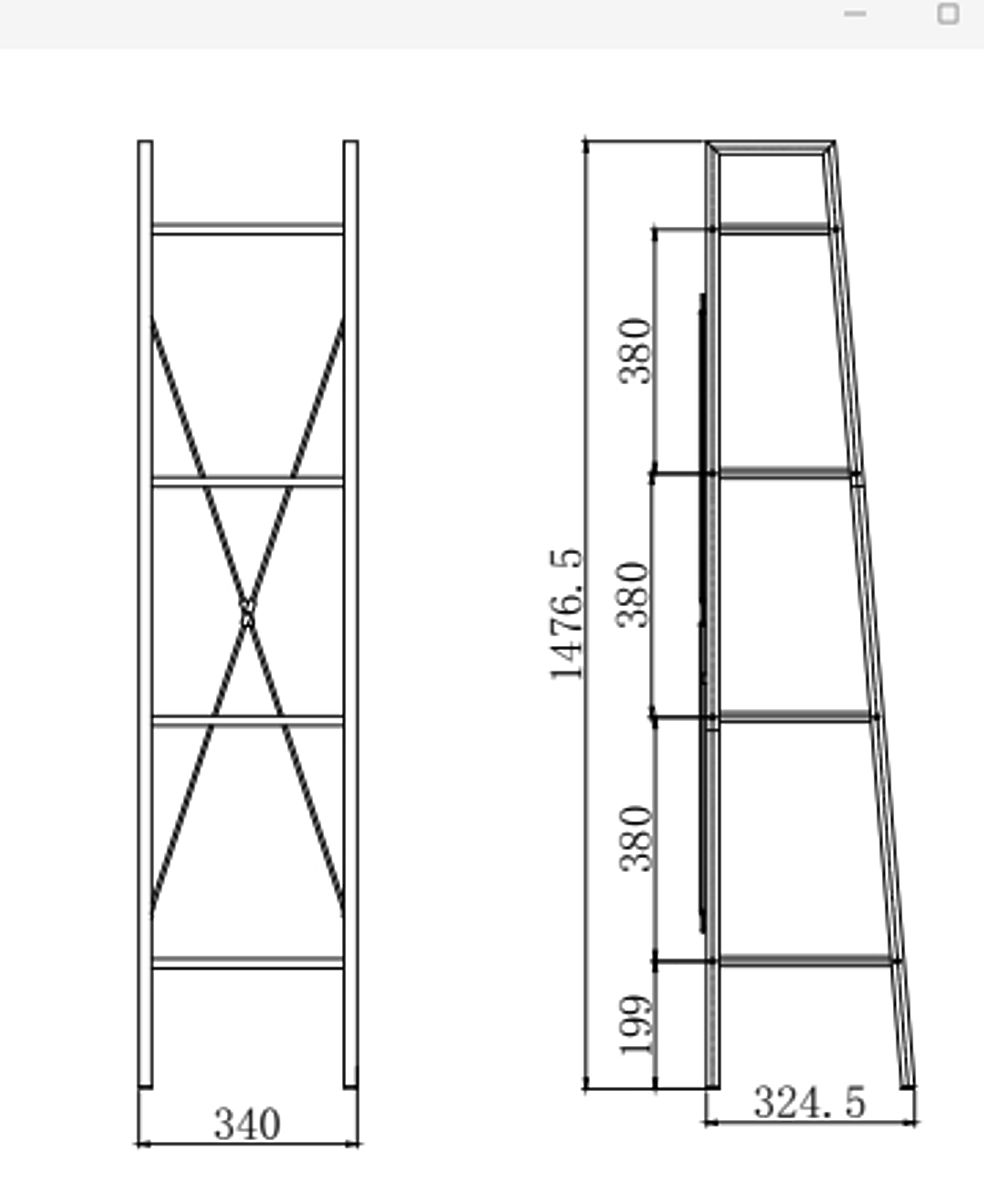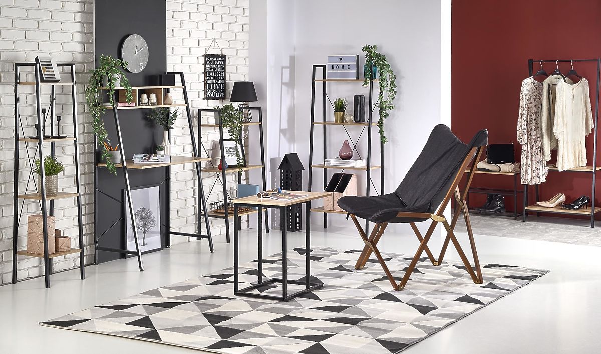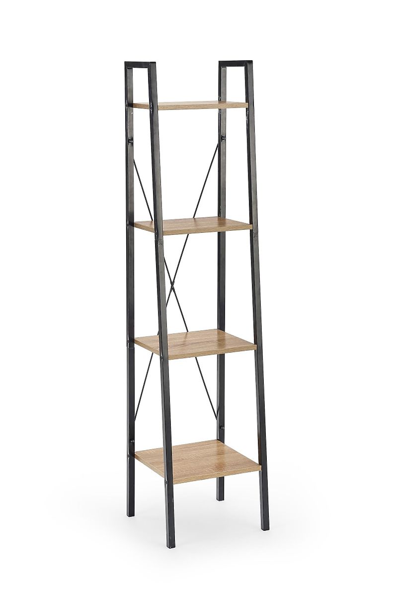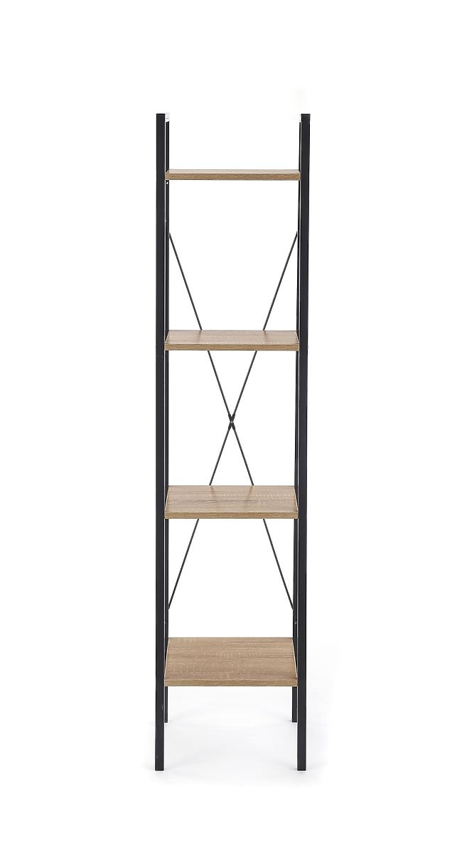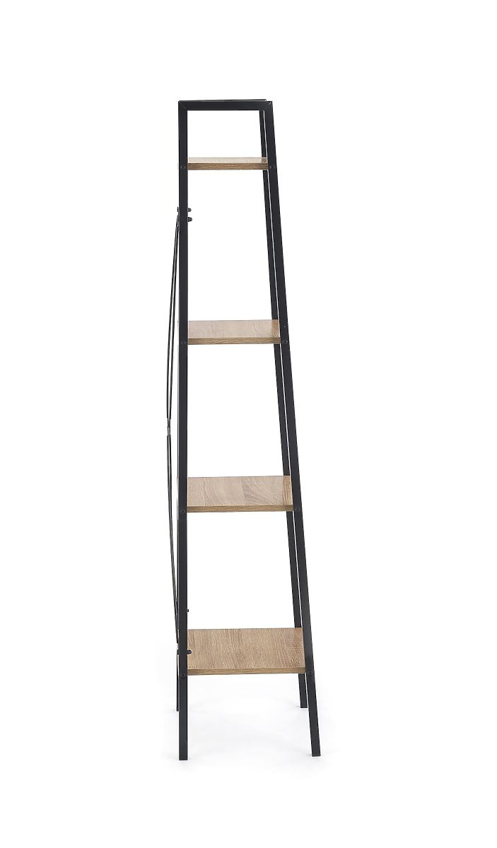 Polica se sastoji od četiri otvorene police koje pružaju pregledan prostor za pohranu knjiga, dekoracija ili dodataka. Police od laminirane iverice u dekoru hrasta sonoma nadopunjene su čvrstom konstrukcijom od crno lakiranog čelika, koja osigurava stabilnost i naglašava industrijski izgled.