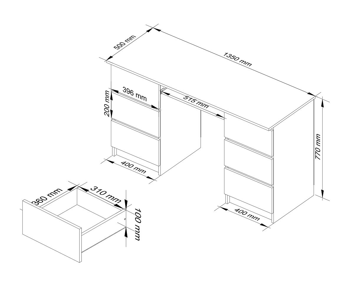 Računalni stol A-11 135 cm u bijeloj boji s prednjim površinama u nijansi sonoma je funkcionalan, praktičan i ergonomski namještaj, opremljen s 6 vrlo praktičnih, korisnih i prostranih ladica. To omogućuje bolju organizaciju prostora putem uređenog spremanja stvari koje mogu biti korisne našoj djeci tijekom učenja ili pisanja domaćih zadaća. Na kraju, treba imati na umu da naša djeca sve češće koriste prednosti tehnologije u obliku računala i interneta tijekom ispunjavanja školskih obveza.