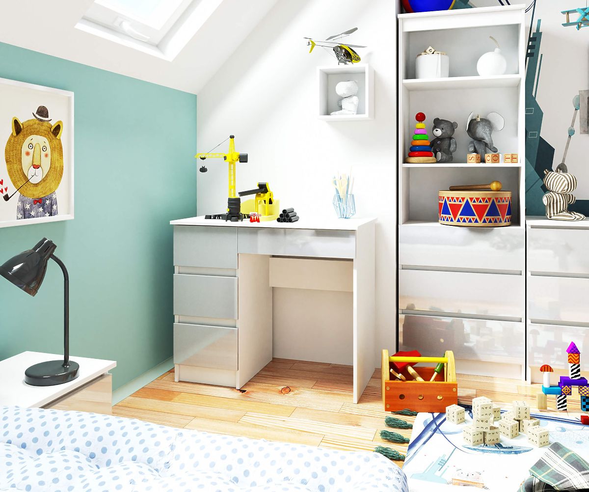 Pisaći stol s četiri ladice za mladež, bijele i metalik boje. .. više