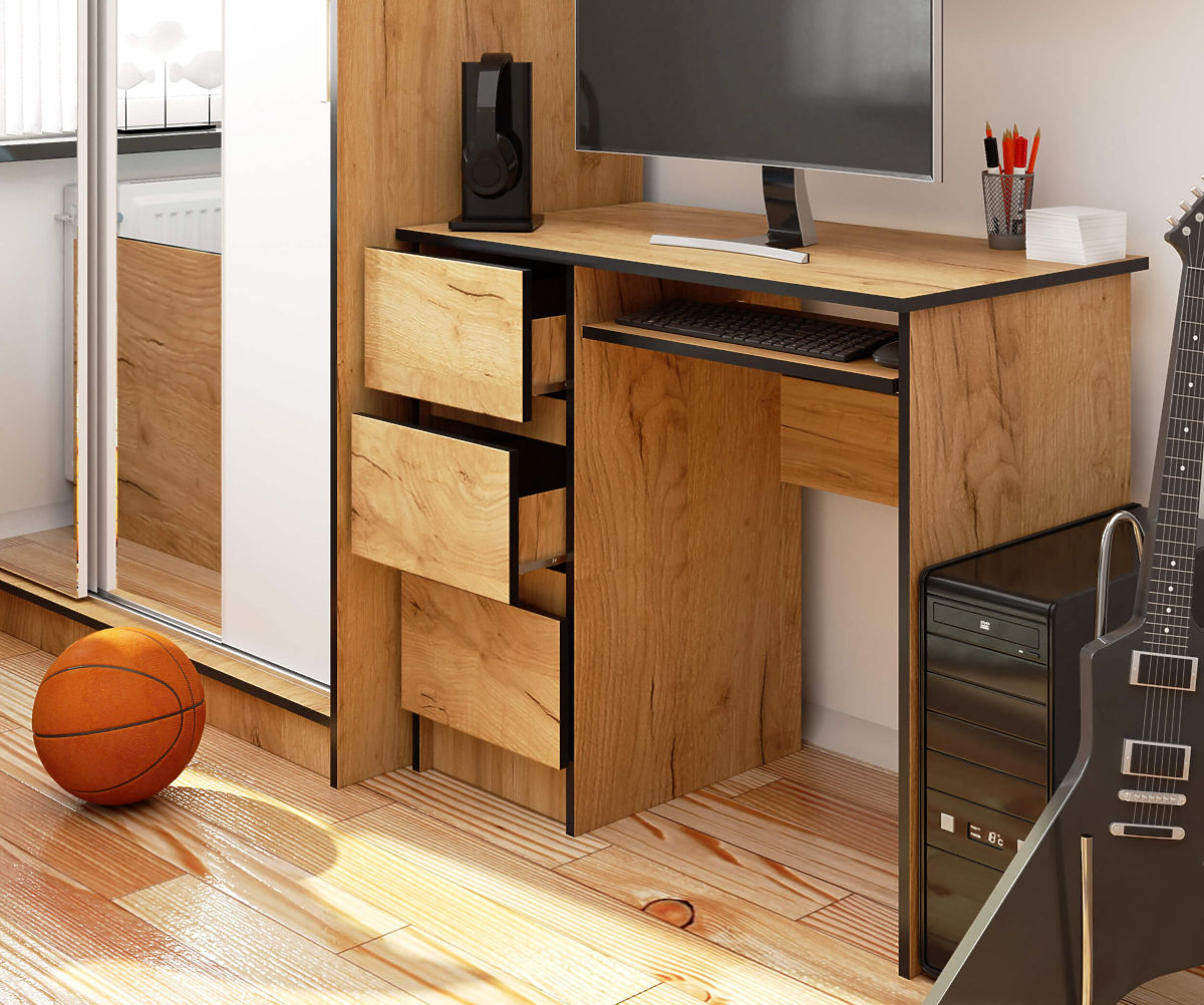 Računalni stol može biti funkcionalan i istovremeno elegantno izgledati. Primjer je namještaj iz naše ponude: pisaći stol A-6 90 cm LIJEVI u boji hrast craft, koji izgleda kao pravo drvo. Odlikuje se solidnom izradom i funkcionalnošću. Pisaći stol je idealan za dnevni boravak, dječju sobu ili ured, olakšava učenje i rad pred ekranom računala.