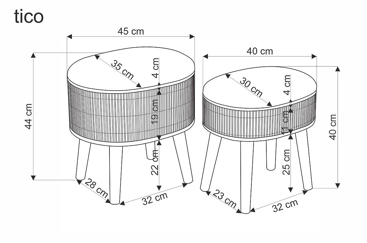 Set dvaju tabureta TICO predstavlja elegantno i praktično rješenje za moderne i ugodno uređene interijere. Zahvaljujući svom nježnom ovalnom obliku, prirodnom drvu i bež presvlaci, djeluje skladno i bezvremenski, te lako postaje stilski dodatak dnevnom boravku, spavaćoj sobi ili predsoblju. Tabureti su presvučeni ugodnom tkaninom u bež nijansi koja prostoru daje toplinu i mekoću. Stabilna konstrukcija od masivnog kaučukovog drva u prirodnoj izvedbi osigurava čvrstoću i dugotrajnost. Svaki taburet dodatno je opremljen praktičnim prostorom za pohranu, idealnim za pohranu deka, jastuka, sitnica ili kućnih dodataka. Zahvaljujući različitim dimenzijama, tabureti se mogu koristiti samostalno ili ih praktično kombinirati prema trenutnim potrebama. Odlično služe kao dodatno sjedenje, oslonac za noge ili dekorativni element interijera. Isporučuju se u rastavljenom stanju za jednostavnu manipulaciju.
