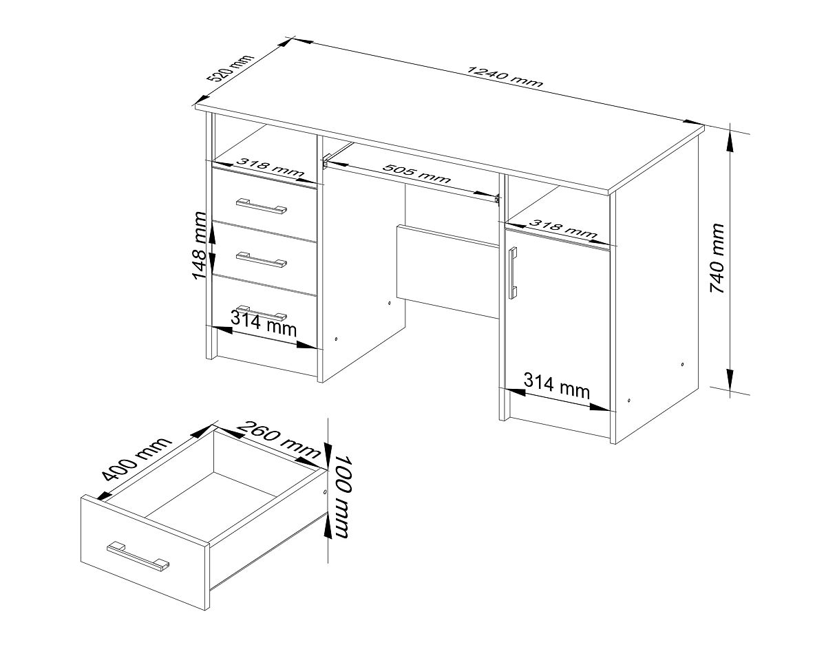Izrađen od laminirane ploče otporne na habanje. Ploča, stranice i frontovi obloženi su ABS rubom. Ima izvlačnu policu za tipkovnicu, 3 ladice i vrata s frontovima od laminirane ploče.