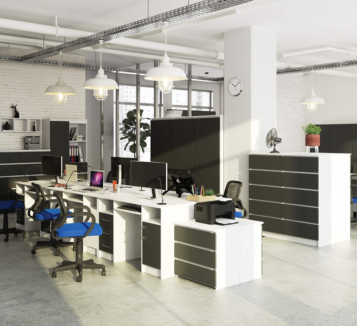 Računalni stol ANA 124 cm zahvaljujući klasičnoj kombinaciji bijele i grafitno sive boje lako se uklapa u svaki interijer. Dizajniran je s obzirom na uredske prostore i radne sobe. Također je prikladan za sobu tinejdžera. Na ploči stola ima puno mjesta – možete postaviti monitor i druge potrebne radne predmete prema potrebi. Za tipkovnicu postoji zasebna izvlačna polica. Stol nudi mnogo prostora za različite aranžmane: dvije niše, tri ladice i ormarić s policom. Cijela konstrukcija izrađena je od laminirane ploče koja je jednostavna za održavanje i otporna na habanje. Stol ANA je elegancija, funkcionalnost i čvrstoća u jednom.