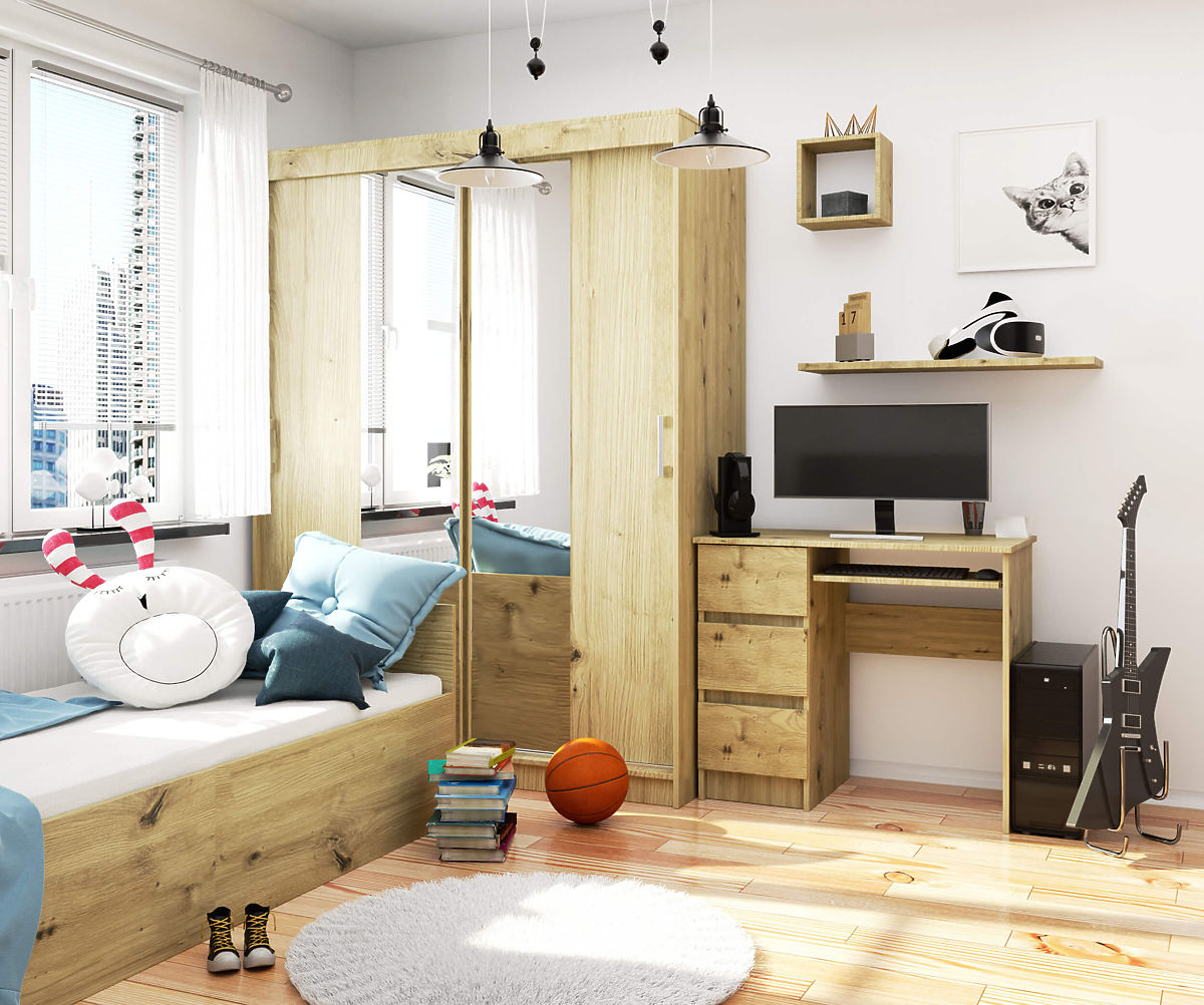 Računalni stol A-6 hrast artisan savršeno se uklapa u dječju i mladenačku sobu, ali i u radnu sobu. Njegove male dimenzije omogućuju i organizaciju prostora za učenje ili rad od kuće u spavaćoj ili dnevnoj sobi. Stol je također idealan za male, ugodne urede. Zahvaljujući boji hrast artisan, namještaj se uklapa kako u moderne, tako i u klasične namještajne elemente.