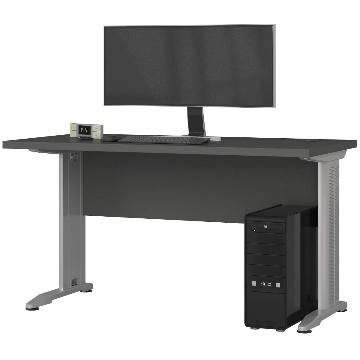 Samostojeći grafitno sivi računalni stol s metalnim nogama. .. više