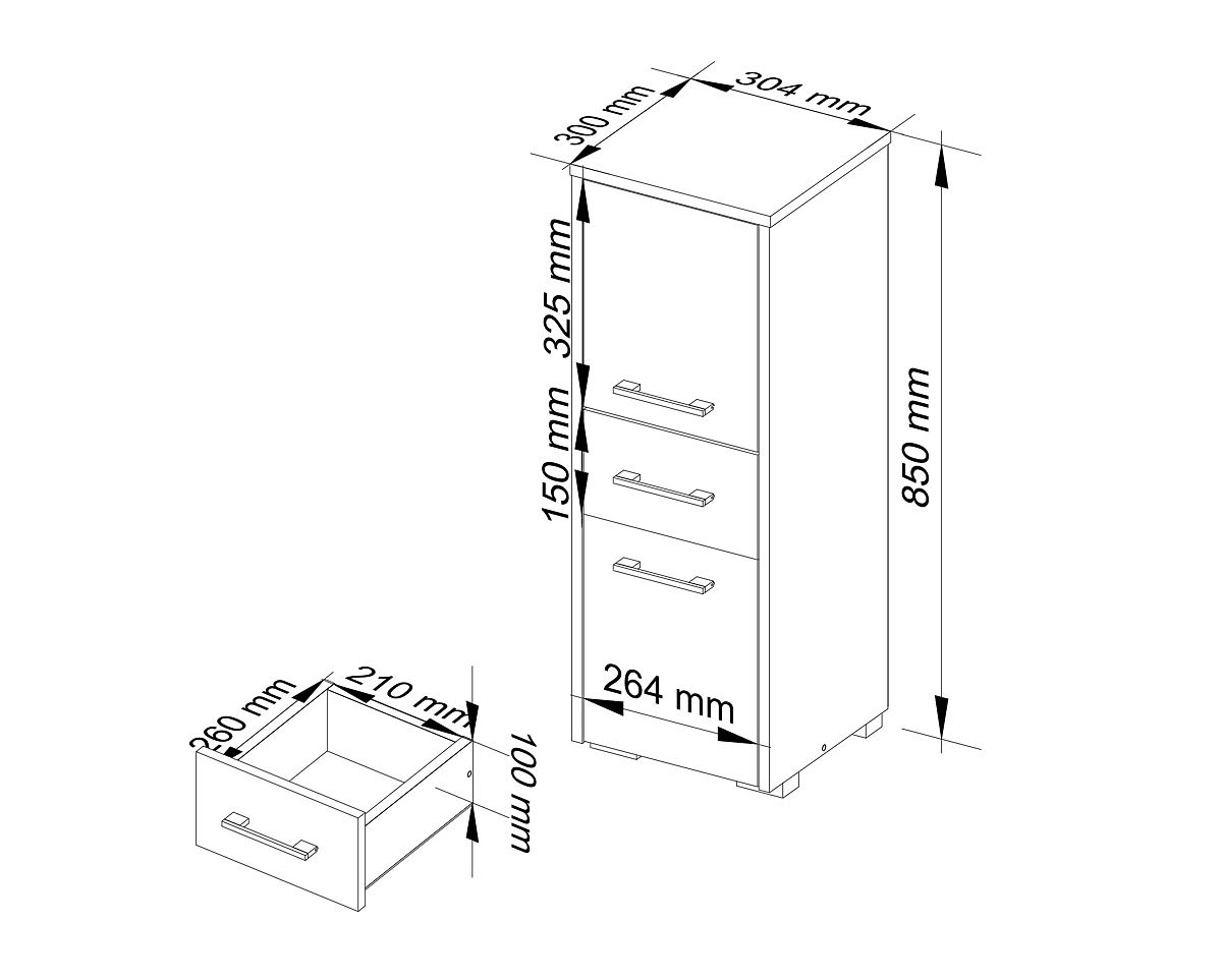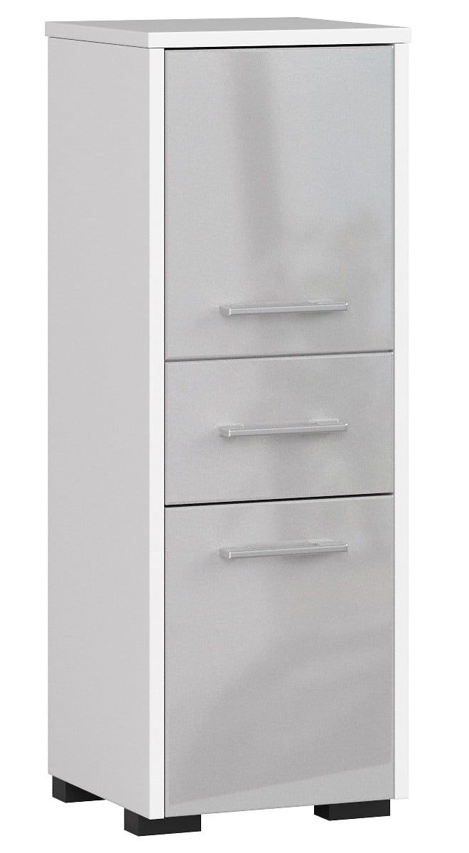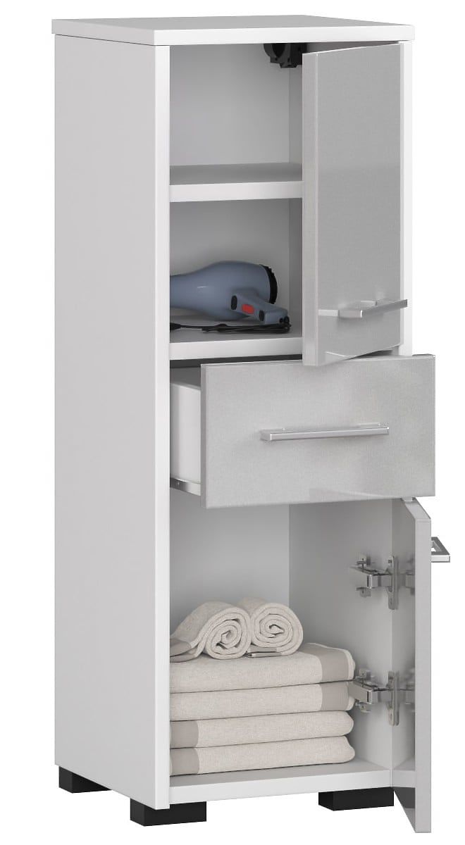 Kupaonski stup FIN s ladicom i dvoja preklopna vrata izrađen je od visokokvalitetne, habanju otporne laminirane ploče Kronospan. Bijeli korpus namještaja savršeno se slaže s prednjim stranama s akrilnom površinom visokog sjaja u metalik boji. Ispod ploče stupa smješten je ormarić s dvije police i vratima. Ispod se nalazi ladica, a ispod nje još jedan ormarić – ovaj put s jednom policom. Elegantni kupaonski ormarić upotpunjuju zanimljive, udobne i jednostavne ručke.