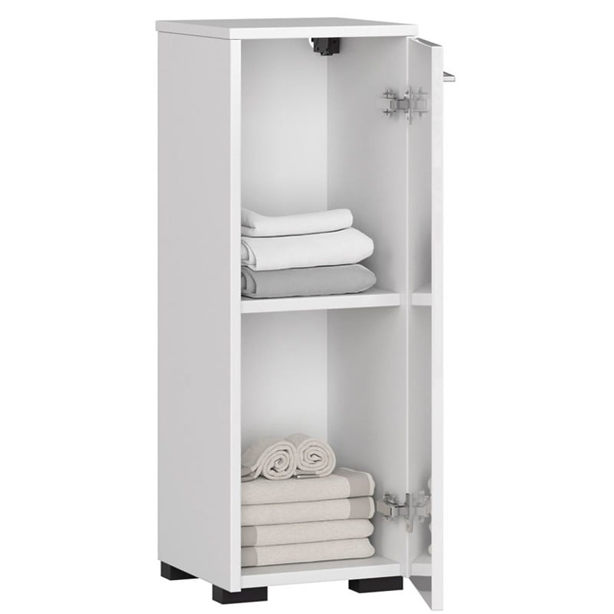 Kupaonski ormarić s preklopnim vratima. Stojeća verzija komode s policom unutar vrata. Boja bijela, prednje površine bijeli sjaj.
