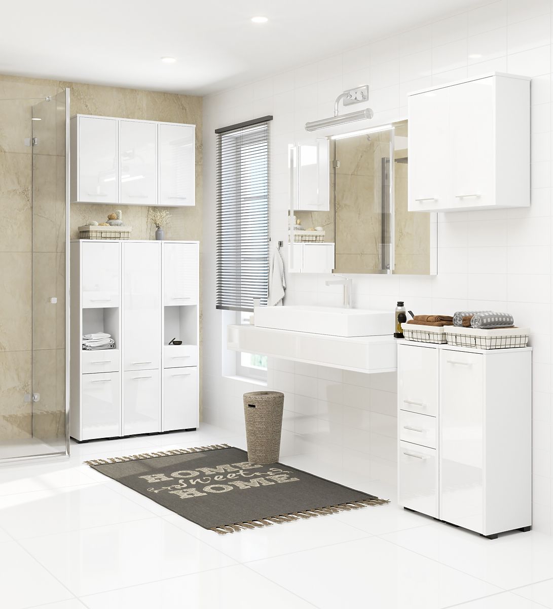 Stojeći kupaonski ormarić s bijelim sjajnim površinama i preklopnim vratima. .. više