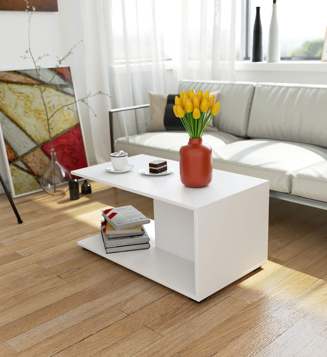 Bijeli konferencijski stol uspješno spaja funkcionalnost i vizualnu privlačnost. Namještaj je prikladan za dnevni boravak uređen u klasičnom ili modernom stilu. Konferencijski stol od 90 cm izrađen je od visokokvalitetne laminirane ploče, što ga čini otpornim na habanje. Stol se može često čistiti mokrim načinom bez oštećenja njegove ploče. Mala veličina stola osigurava da je prikladan kako za male, tako i za velike dnevne boravke. Na konferencijskom stolu možete udobno uživati u kavi i čaju, čitati knjige i časopise ili provoditi slobodno vrijeme igrajući društvene igre. Stol za dnevni boravak opremljen je dodatnom donjom policom veličine gornje ploče, što značajno povećava njegovu funkcionalnost. Policu možete koristiti za časopise ili diskove, ili je ostaviti slobodnom za jednostavno odlaganje stvari, npr. ručnih radova. Konferencijski stol može se koristiti i u dekorativne svrhe, postavljanjem dizajnerske lampe ili cvjetne kompozicije.
