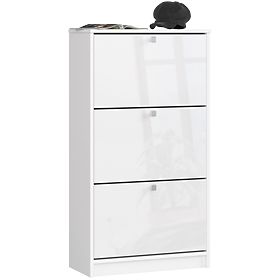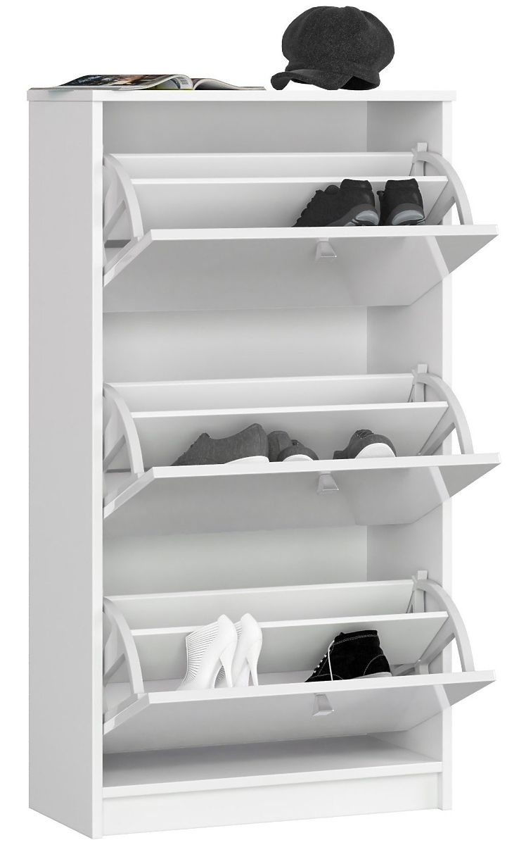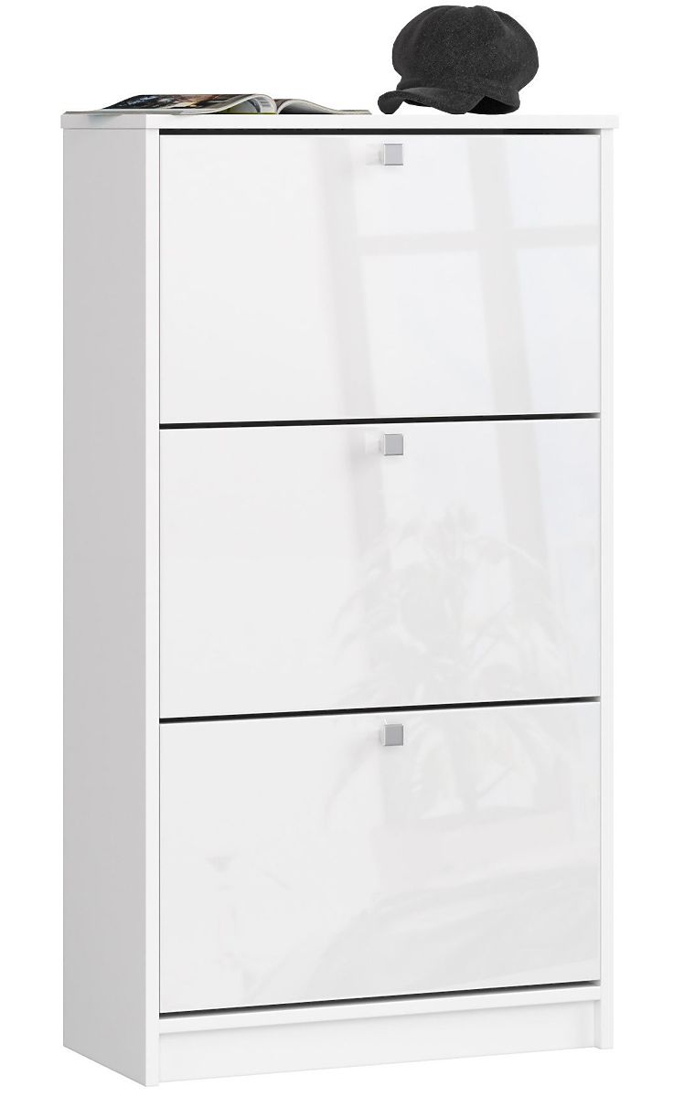 Bijeli ormar ima tri ladice s preklopnim vratima i ručkama u satenskoj nijansi. Namještaj je namijenjen za pohranu svih vrsta obuće i sredstava za čišćenje obuće. Ormar se uklapa kako u velike, tako i u manje hodnike. Jednostavan u formi i univerzalne boje, namještaj se dobro uklapa u moderno i klasično uređenje te uz zidove tamnijih i svjetlijih boja. Ormar za cipele bit će izvrsno rješenje za mali i nedovoljno osvijetljen hodnik, jer bijela vizualno povećava i osvjetljava prostorije. Korpus ormara izrađen je od laminirane ploče koja je otporna na habanje i ogrebotine. Rubovi namještaja pažljivo su završeni izdržljivim ABS rubom. Za izradu prednjih strana ormara proizvođač je koristio MDF ploču s trajnom akrilnom površinom s najvišim standardom sjaja, što čini namještaj izuzetno elegantnim. Ormar za cipele lako se održava čistim brisanjem suhom ili vlažnom krpom.