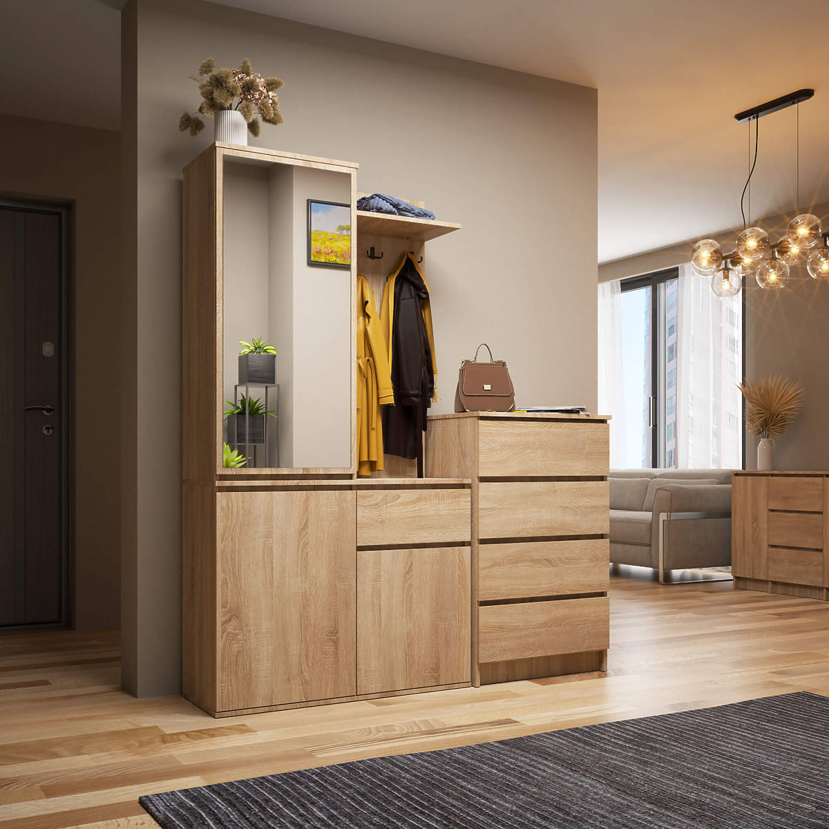 Ormar za predsoblje ENTRO opremljen je ormarićem s ogledalom, dvama manjim ormarićima s unutarnjim policama, ladicom, 5 vješalica u obliku kukica i dodatnom policom iznad vješalica. Takav raspored čini namještaj multifunkcionalnim i iznenađujuće prostranim. U ormariću s ogledalom nalazi se praktična šipka za vješanje odjeće. Otvorena polica korisna je za odlaganje svakodnevnih sitnica. Plitki ormar za predsoblje ne zauzima puno prostora, pa se može uspješno smjestiti i u mali i uski prostor. Dekor elegantno nadopunjuje dodatni namještaj za predsoblje iz ponude Fabryki Mebli AKORD.
