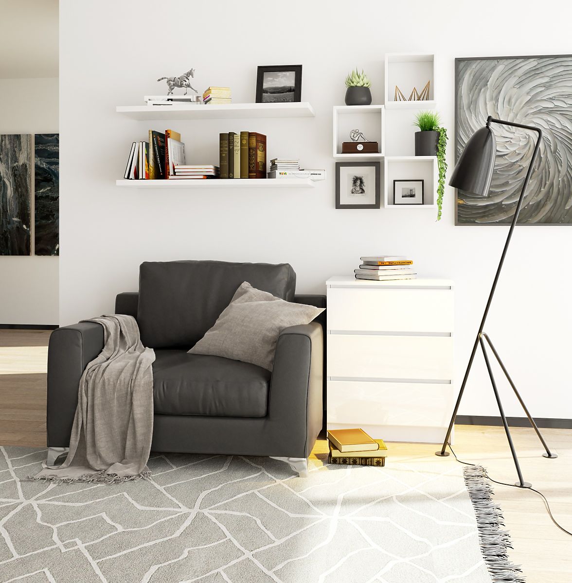 Komoda s tri ladice u bijelom akrilnom sjaju. .. više