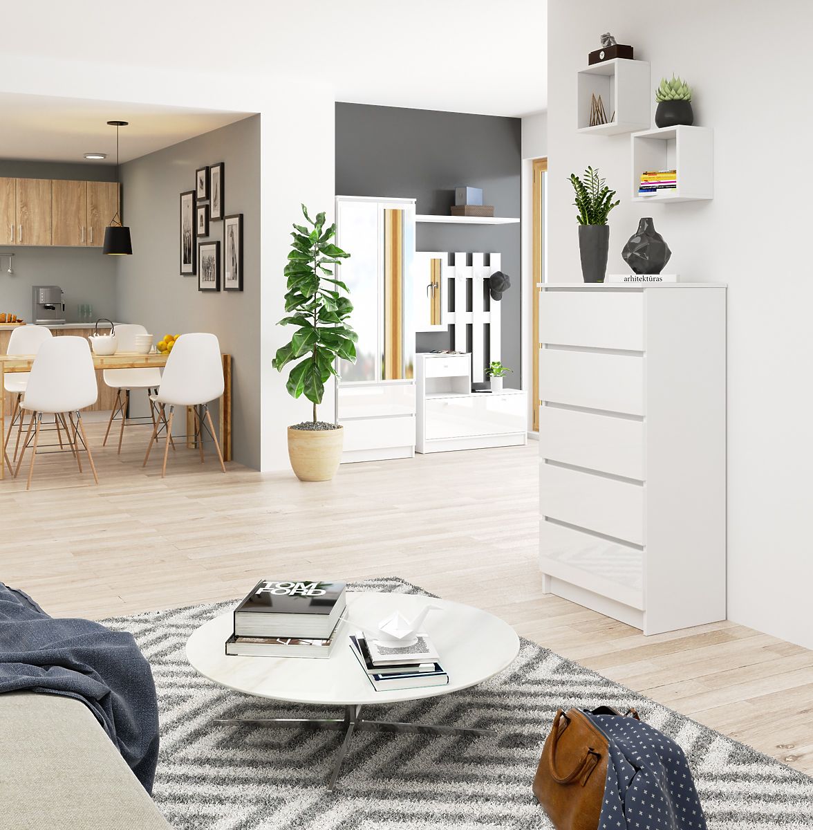 Prostrana komoda opremljena s četiri ladice je namještaj koji će naći primjenu u mnogim stambenim i uredskim prostorima. Omogućuje organizaciju prostora za pohranu potrebnih predmeta u spavaćoj sobi, dnevnom boravku, dječjoj ili studentskoj sobi. Odlično se uklapa i u kućni ured ili predsoblje. Kombinira jednostavan i elegantan izgled, bezvremensku boju i čvrstu konstrukciju. KOMODA K 60 cm u bijeloj boji opremljena je akrilnim prednjim stranama visokog sjaja.
