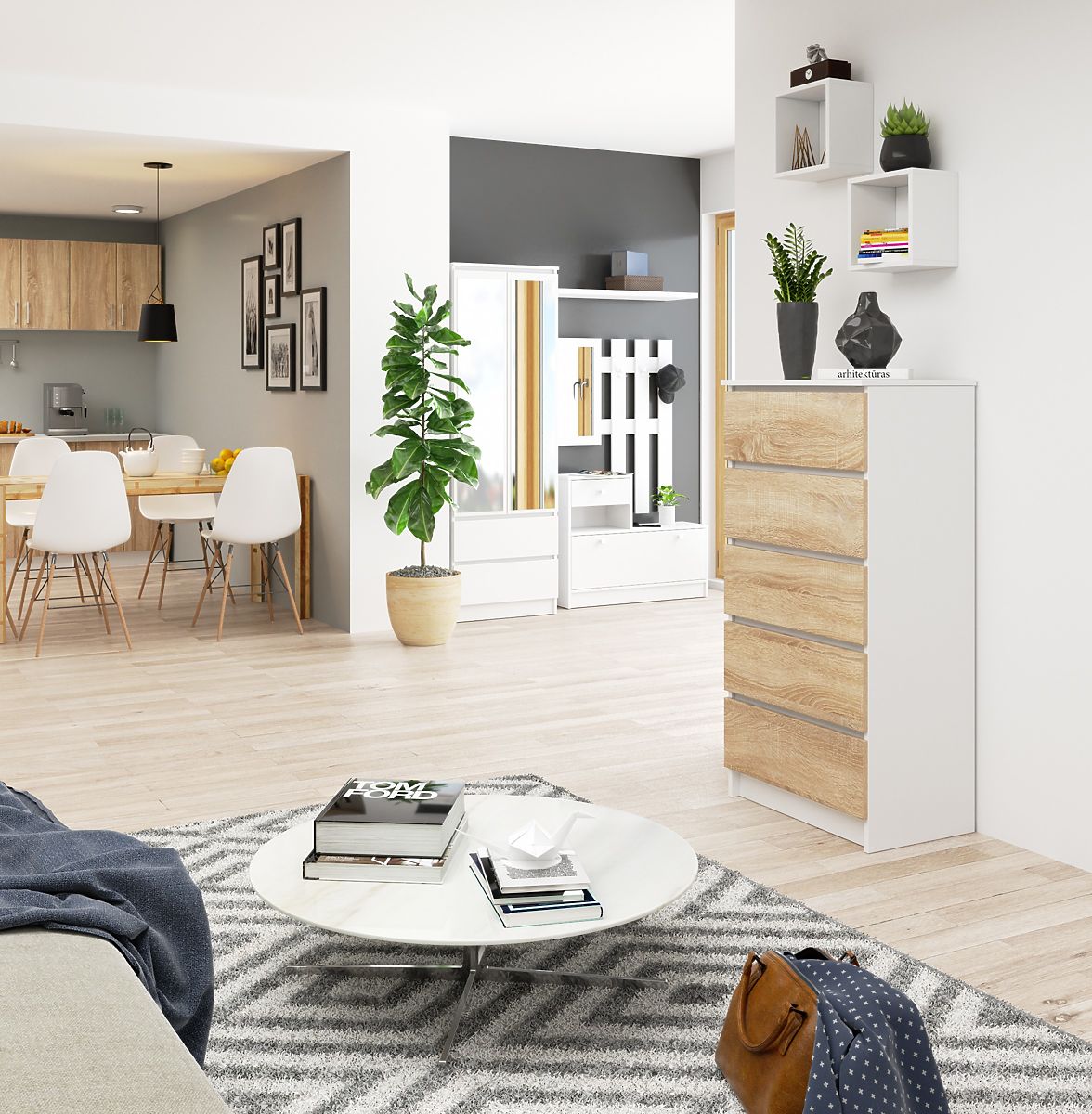 Komoda s 5 ladica, bijela s frontama u boji hrasta Sonoma. .. više