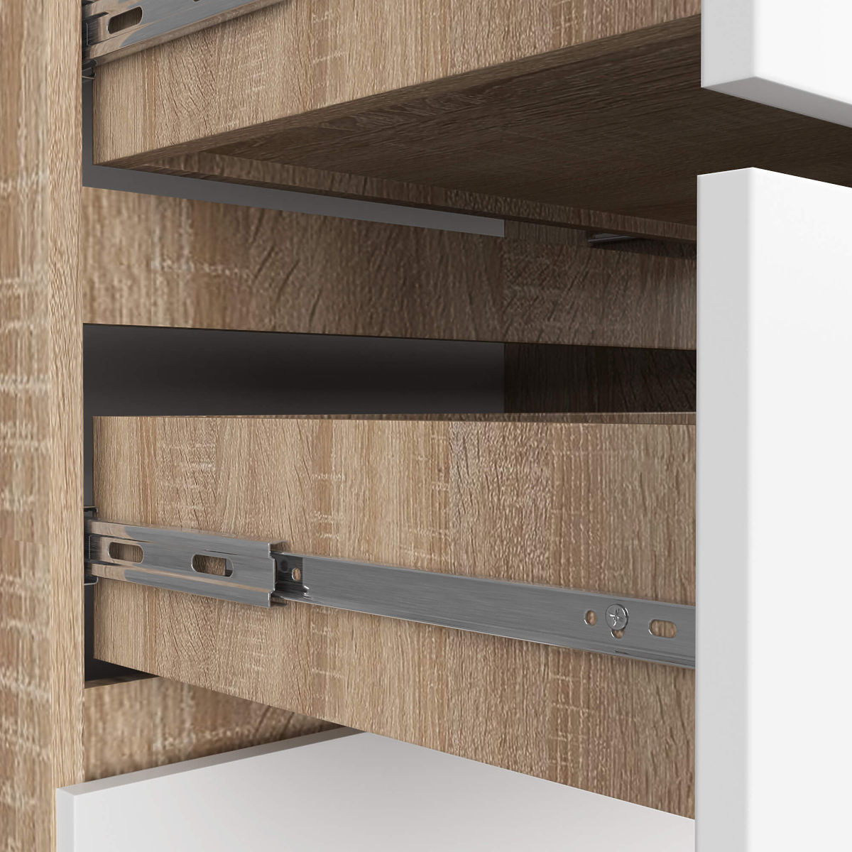 Hrast sonoma je u posljednje vrijeme jedna od najpopularnijih boja namještaja. Stekla je priznanje kupaca zahvaljujući svojoj iznimno univerzalnoj prirodi. Namještaj u boji hrasta sonoma također je vrlo jednostavan za čišćenje, što je njegova nesumnjiva prednost. Druga, jednako popularna boja, je bezvremenska bijela. Namještaj koji nudimo nježna je kombinacija ove dvije boje, što je donijelo izvrstan učinak.