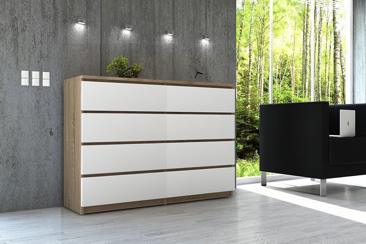 Lijepa, moderno dizajnirana komoda koja se može uspješno koristiti u dnevnom boravku, spavaćoj sobi ili blagovaonici, proizvod je visoke kvalitete. Namještaj je izrađen od laminirane ploče debljine 16 milimetara, otporne na habanje, izdržljive i lijepo se prezentira u svakom interijeru. Rubovi komode obloženi su ABS rubom. Bijele fronte savršeno se uklapaju u suvremene trendove, a posebnu pažnju zaslužuje čvrsta konstrukcija namještaja, koji je opremljen s osam prostranih ladica. Ladice se kreću na metalnim kugličnim vodilicama, a cijeli namještaj je namijenjen za samostalnu montažu. To je ponuda za one koji žele ići u korak s vremenom, a istovremeno biraju namještaj dostupan u bezvremenskoj, univerzalnoj boji. Komodu je moguće kombinirati s drugim namještajem u istom stilu, koji je također dio naše ponude. Preporučujemo da se pobliže upoznate s našim bogatim asortimanom dostupnim po povoljnoj cijeni.
