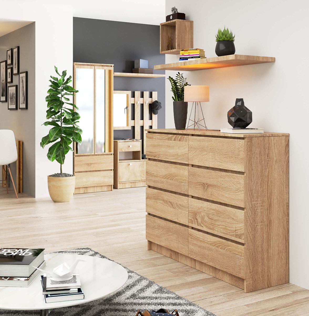 Osam ladica koje mogu primiti sve potrebne stvari u određenoj prostoriji i široka ploča od 120 centimetara - to je komoda K120 u modernoj boji hrasta sonoma. Visokokvalitetni proizvod odlikuje se čvrstom konstrukcijom koja osigurava trajnost proizvoda i univerzalnim dizajnom. Dodatna prednost funkcionalnog namještaja, koji će se izvrsno uklopiti u dnevni boravak, spavaću sobu, blagovaonicu ili ured, je atraktivna cijena. U našoj internetskoj trgovini kupci također mogu očekivati dodatne prijedloge za unutarnje uređenje u boji hrasta sonoma, koji će ugodno iznenaditi svojom praktičnošću kako u uredu, tako i kod kuće. Preporučujemo iskoristiti našu ponudu i sastaviti set prilagođen specifičnim potrebama.