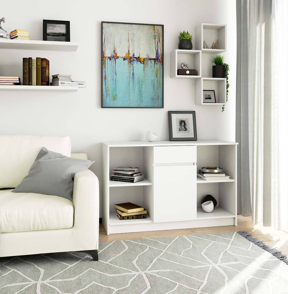 Bijela komoda s modularnim dizajnom i jednom ladicom. .. više