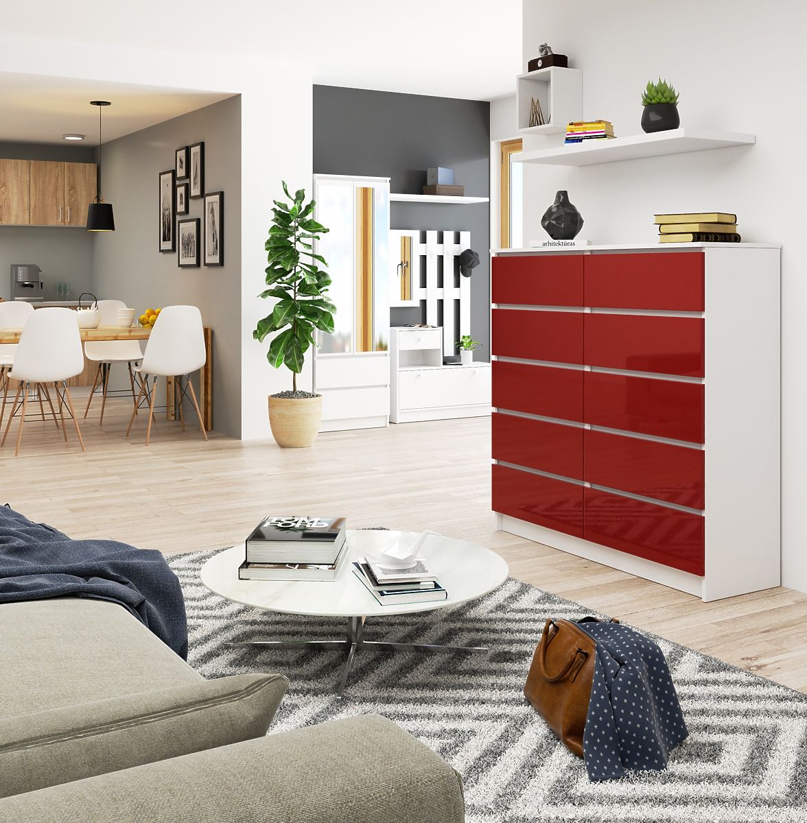 Komoda, model K je namještaj s izraženom, energičnom bojom. Duboka crvena prednja strana s sjajnom površinom i bijelim mat korpusom izgledaju vrlo zanimljivo. Dojam pojačava sjajna struktura koja reflektira svjetlost i stvara efektne odsjaje na površini namještaja.