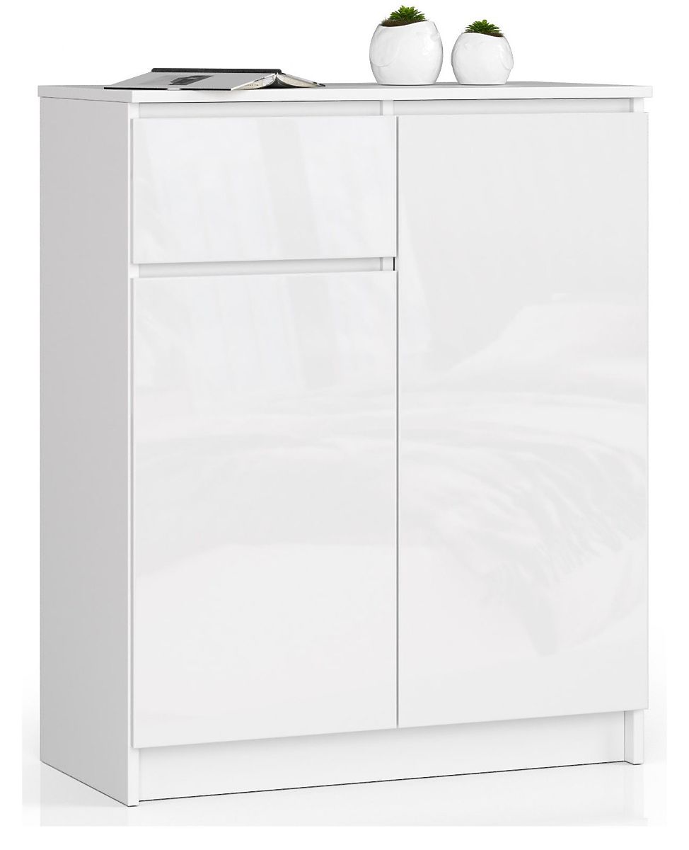 Mala bijela komoda opremljena je praktičnom ladicom i dvjema zatvorenim ormarićima - u svakom od njih nalaze se dvije police. Namještaj se ističe čvrstom konstrukcijom i pažljivom izradom. Predstavljena ponuda zadovoljit će oko i ispuniti očekivanja i najzahtjevnijih kupaca u smislu funkcionalnosti. Komoda K 80 cm kombinacija je bijelog korpusa s prednjim površinama visokog sjaja u istoj boji. Elegantni namještaj nesumnjivo će se odlično uklopiti u mnoge interijere uređene u skandinavskom, minimalističkom ili modernom stilu.