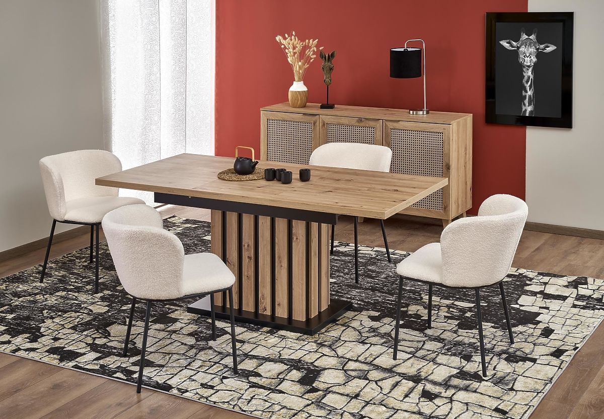 Stol je izrađen od izdržljive laminirane iverice koja imitira prirodno drvo, osiguravajući dugotrajnost i jednostavno održavanje. Središnja noga kombinira crne i drvene elemente, pružajući stabilnost i istovremeno dovoljno prostora za noge svih gostiju.