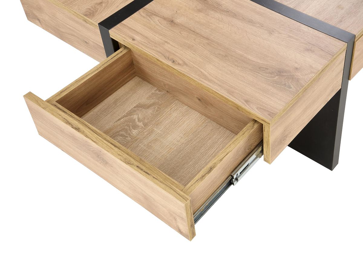 Stilski konferencijski stolić SEVILLA moderan je i funkcionalan dodatak koji se savršeno uklapa u svaku dnevnu sobu. Njegova jedinstvena konstrukcija s četiri skrivena ladica nudi iznenađujuće veliku količinu prostora za pohranu, a da pritom ne narušava čist i elegantan izgled stolića. Zahvaljujući pametnom sustavu otvaranja pomicanjem dijelova gornje ploče, stolić djeluje dinamično, a istovremeno vrlo minimalistički. Konferencijski stolić SEVILLA dizajniran je s naglaskom na praktičnost i estetiku. Kombinacija dekora hrast craft i kontrastnih crnih nogu stvara bezvremenski izgled koji se lako uklapa u moderne i industrijske interijere. Robusna konstrukcija i kvalitetni materijali osiguravaju dugovječnost i udobnost pri svakodnevnoj upotrebi.