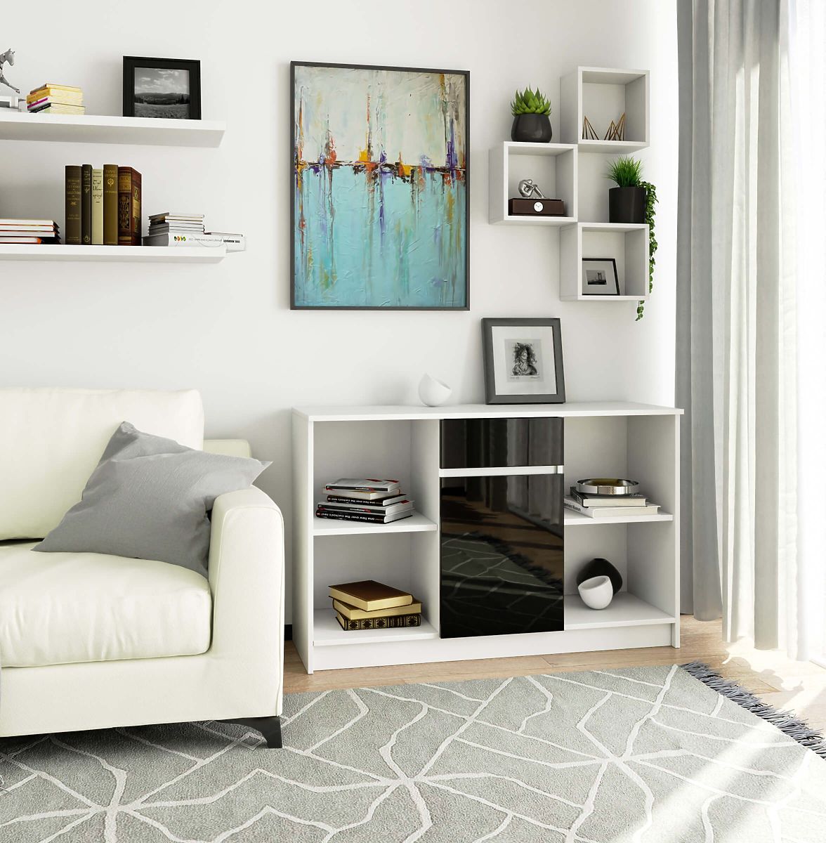 Komoda B-17 120 cm u bijeloj boji s prednjim površinama u crnom sjaju vrlo je prostran komad namještaja, zahvaljujući kojem dobivamo dodatni prostor za korištenje. Bezvremenski, klasični i elegantni karakter proizvoda doprinosi tome da ga možemo koristiti kao dio opreme mnogih različitih prostorija u našem stanu, kao što su dnevni boravak, spavaća soba, kućni ured ili predsoblje. Njena velika funkcionalnost i svestranost u pogledu upotrebe čine je izvrsnim izborom za one koji cijene praktična rješenja.